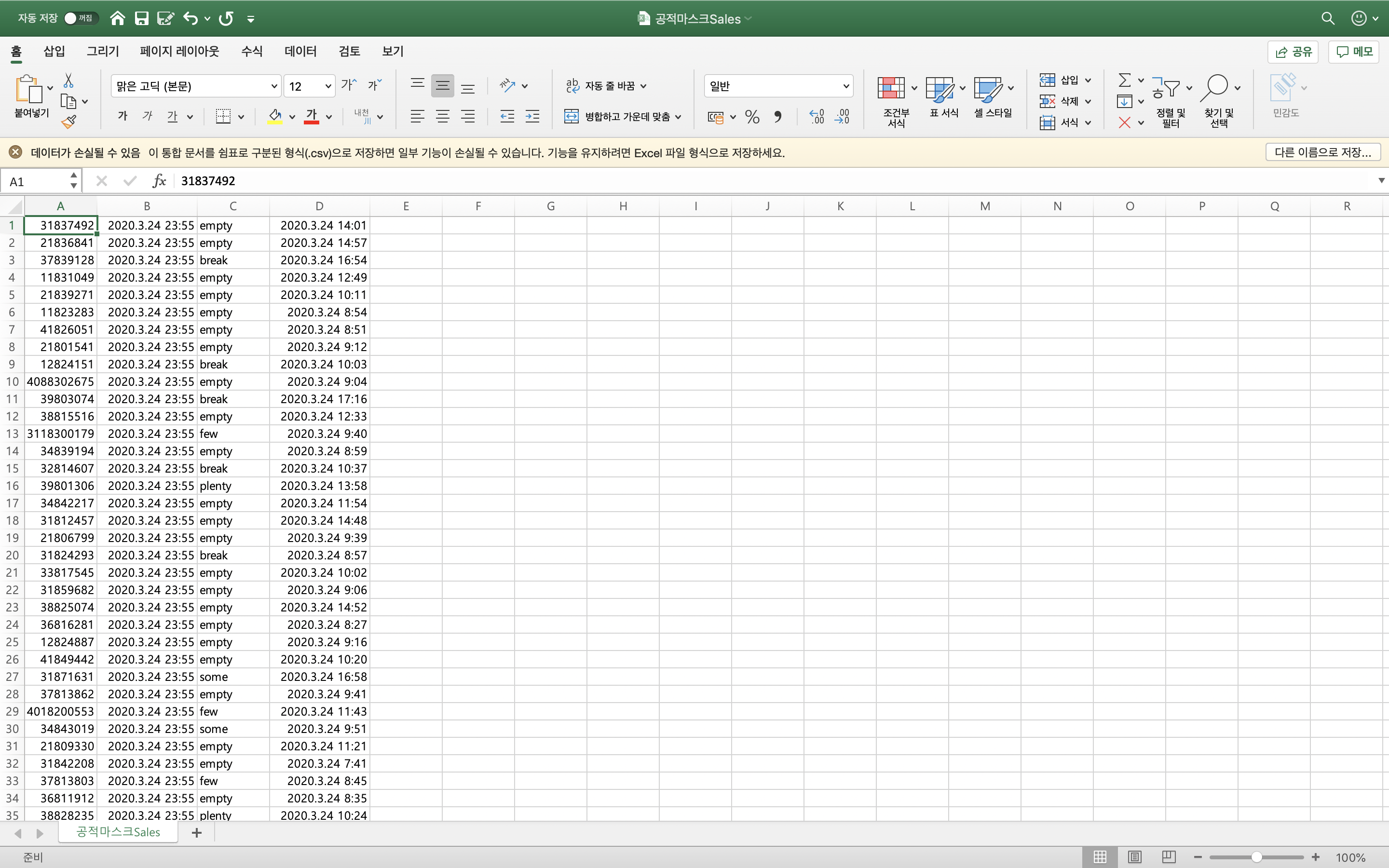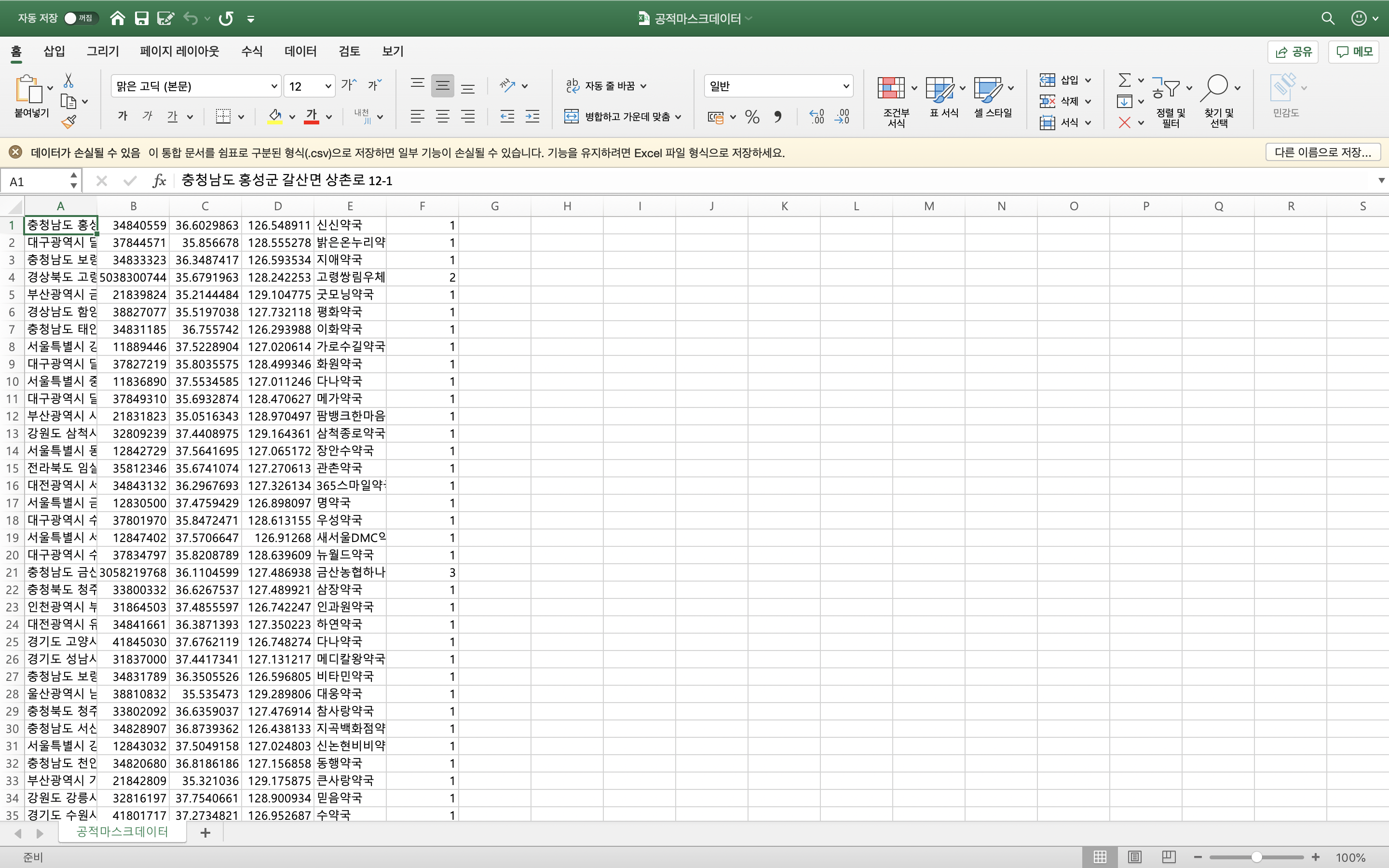 먼저 공적 마스크 판매처 데이터를 저장했습니다.