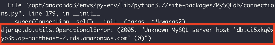 "Unknown MySQL server host 'db.ci5xkq0xyo3b.ap-northeast-2.rds.amazonaws.com' (0)")