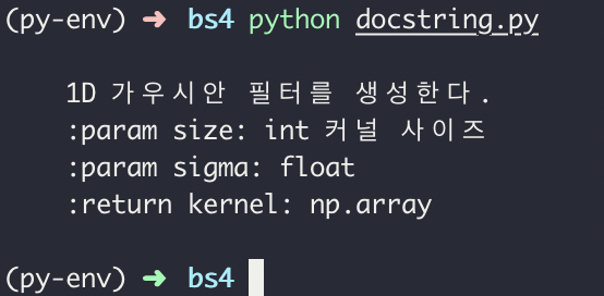 gaussian_filter.py 파일에 get_gaussian_filter_1d 함수를 아래와 같이 선언하고, docstring.py에서 함수의 docstring을 가져와봤습니다.