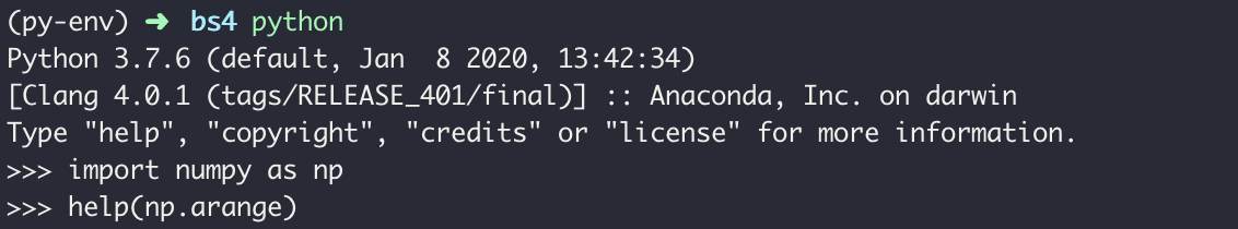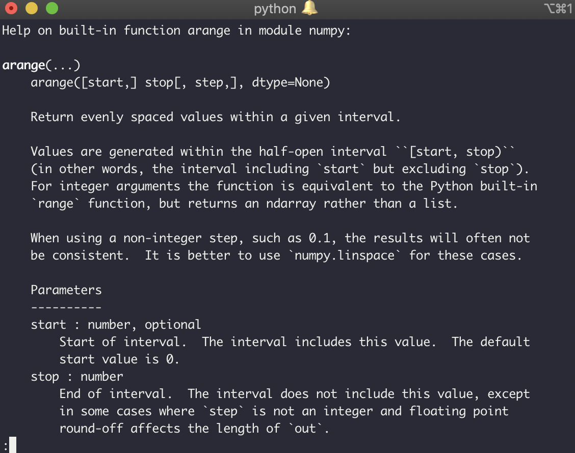 help(np.arange)를 하면 다음과 같이 docstring 만 보여줍니다.