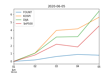 수익률 데이터인데 파운트 수익률 제외하고 KOSPI, DIJA, S&P500이 6월 4일 → 6월 5일에 엄청나게 떡상했습니다. 아니 저렇게 확 오를 수 있는 건가...? 싶고 다음 주도 어떻게 될지 궁금합니다.