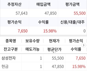47,850원에 1주 산 내 삼성전자... 현재까지 수익률은 15.98%입니다.