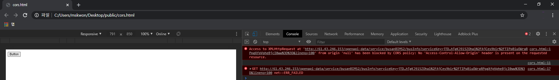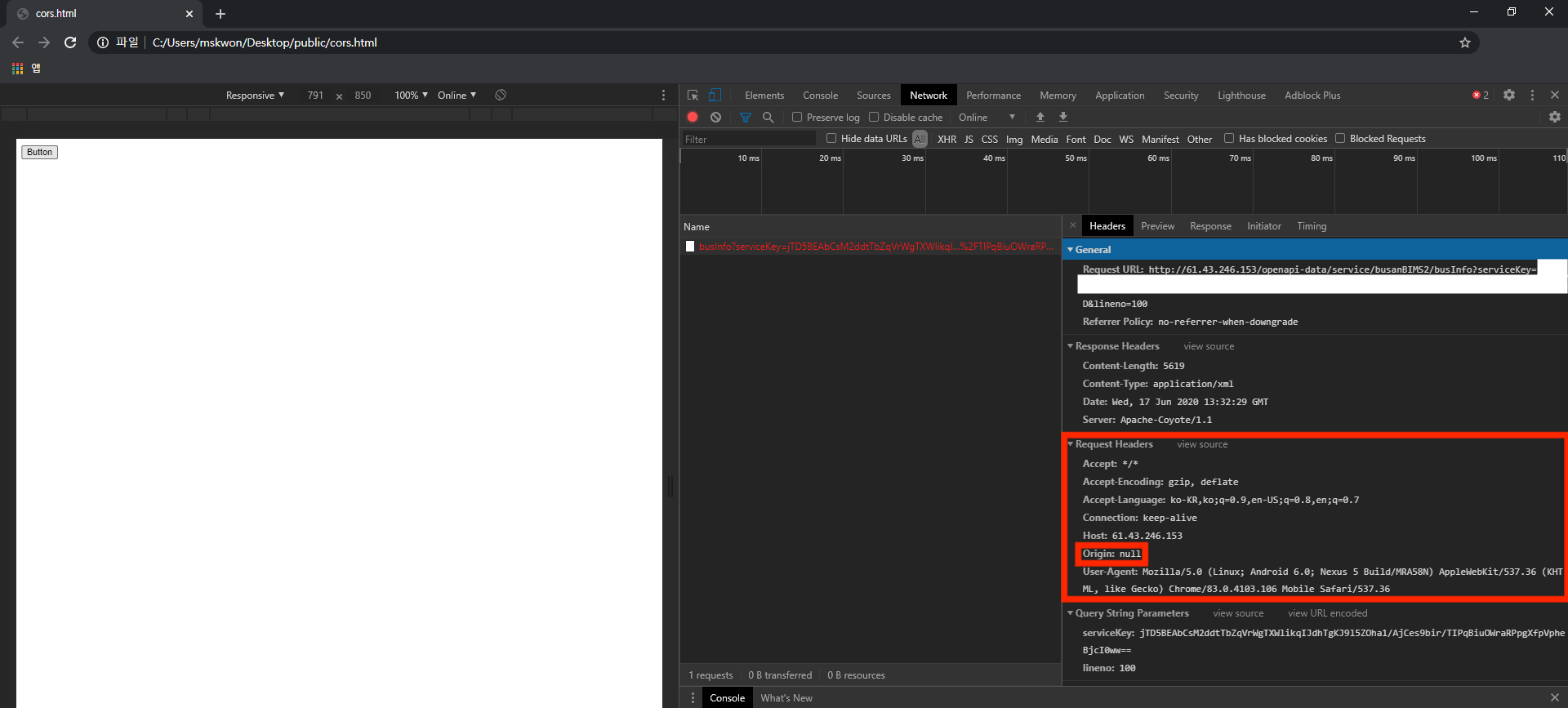 Origin이 null이 되는 로컬 시스템은 빼고, 서버를 하나 만들고 HTML 파일을 실행해야 한다고 생각했습니다.