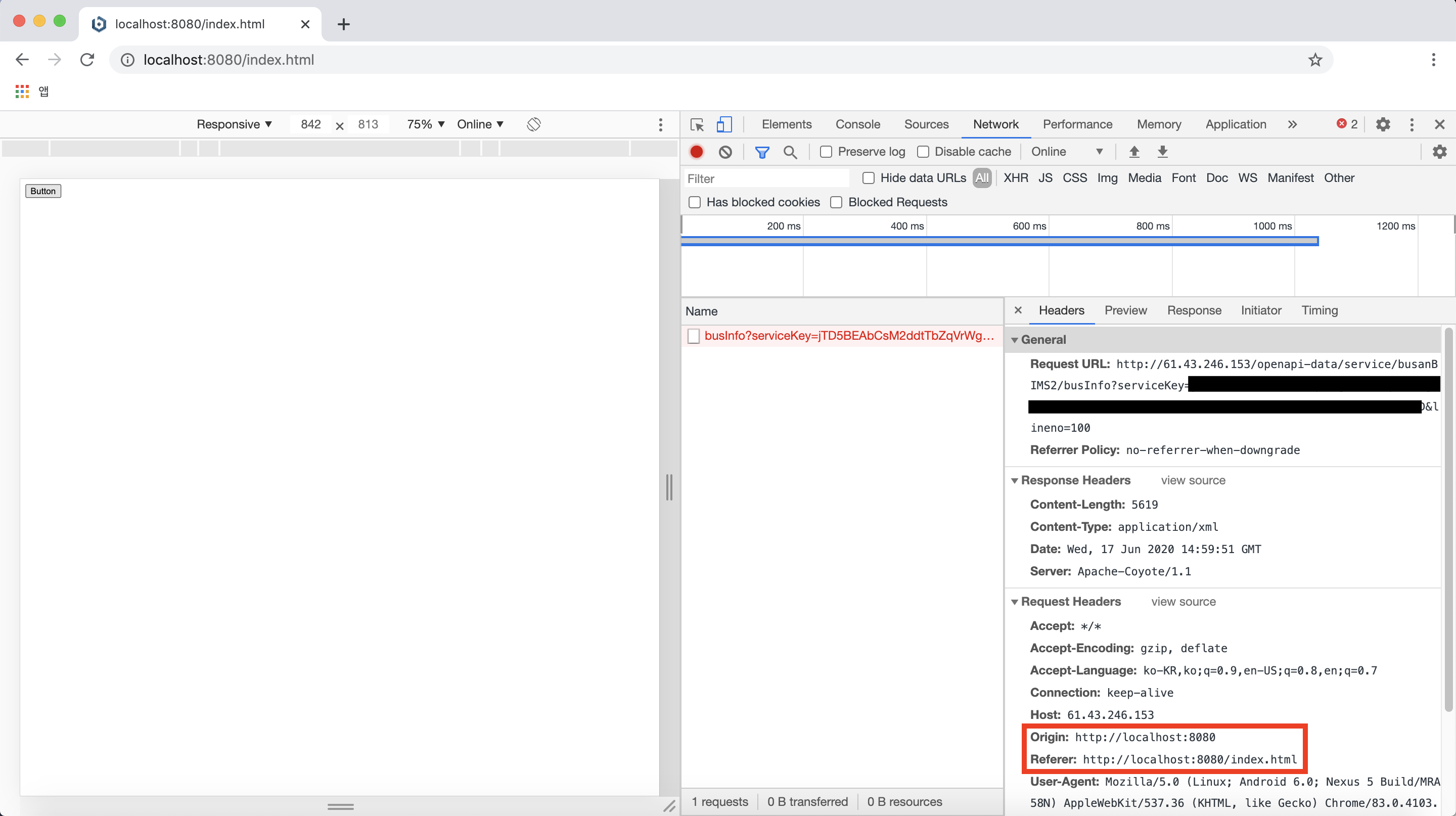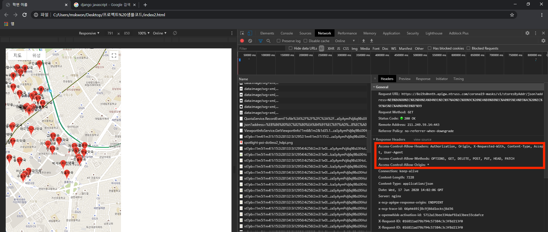 공적 마스크 API 서버에서는 위 헤더가 있어서 origin 헤더가 'null' 이어도 데이터가 받아와졌습니다.