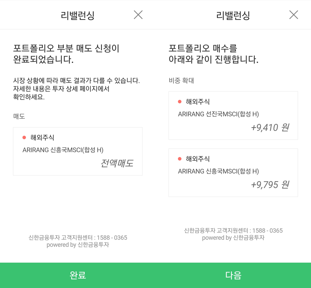추가입금 버튼이 뜨긴 하지만 저는 돈이 없기때문에ㅎㅎ 추가입금은 진행하지 않고, 리밸런싱을 진행했습니다.