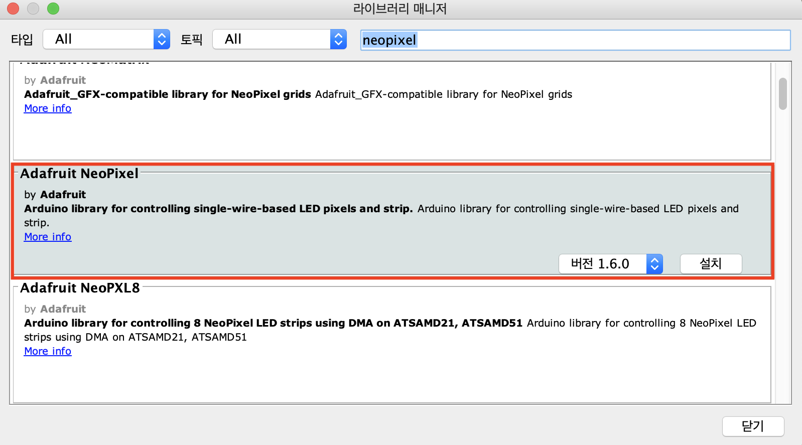 Adafruit NeoPixel 라이브러리를 검색하고 설치해줍니다.