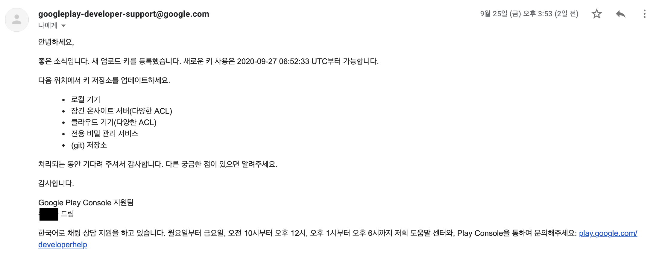Android App Bundle이 잘못된 키로 서명되었습니다. 올바른 서명 키(SHA1:~)로 App Bundle에 서명한 다음 다시 시도해 보세요. 에러메시지가 떠서 급하게 다시 키스토어를 찾아봤지만ㅠㅠ 이미 미국간 키스토어 파일이 다시 생길리 만무합니다.