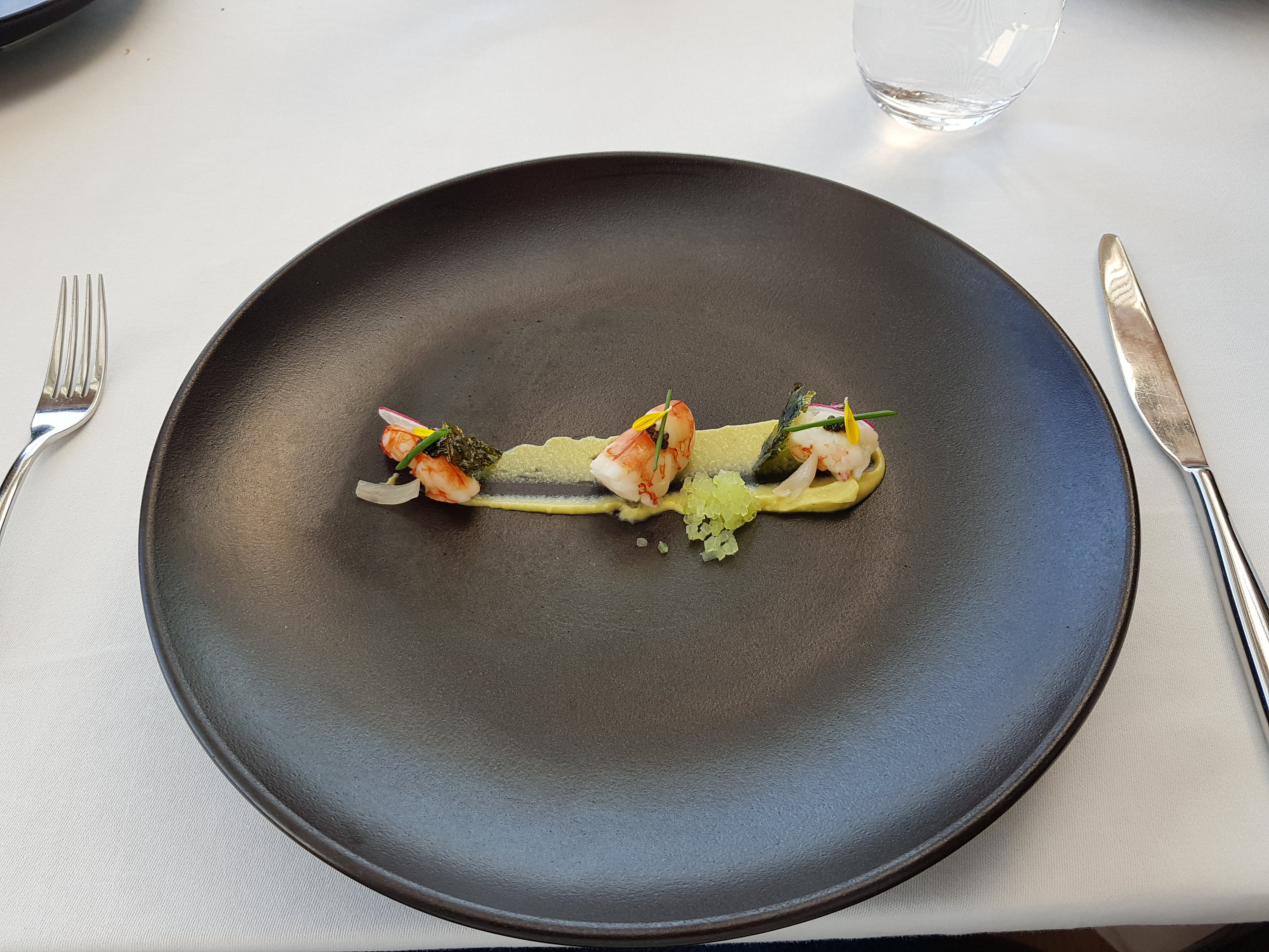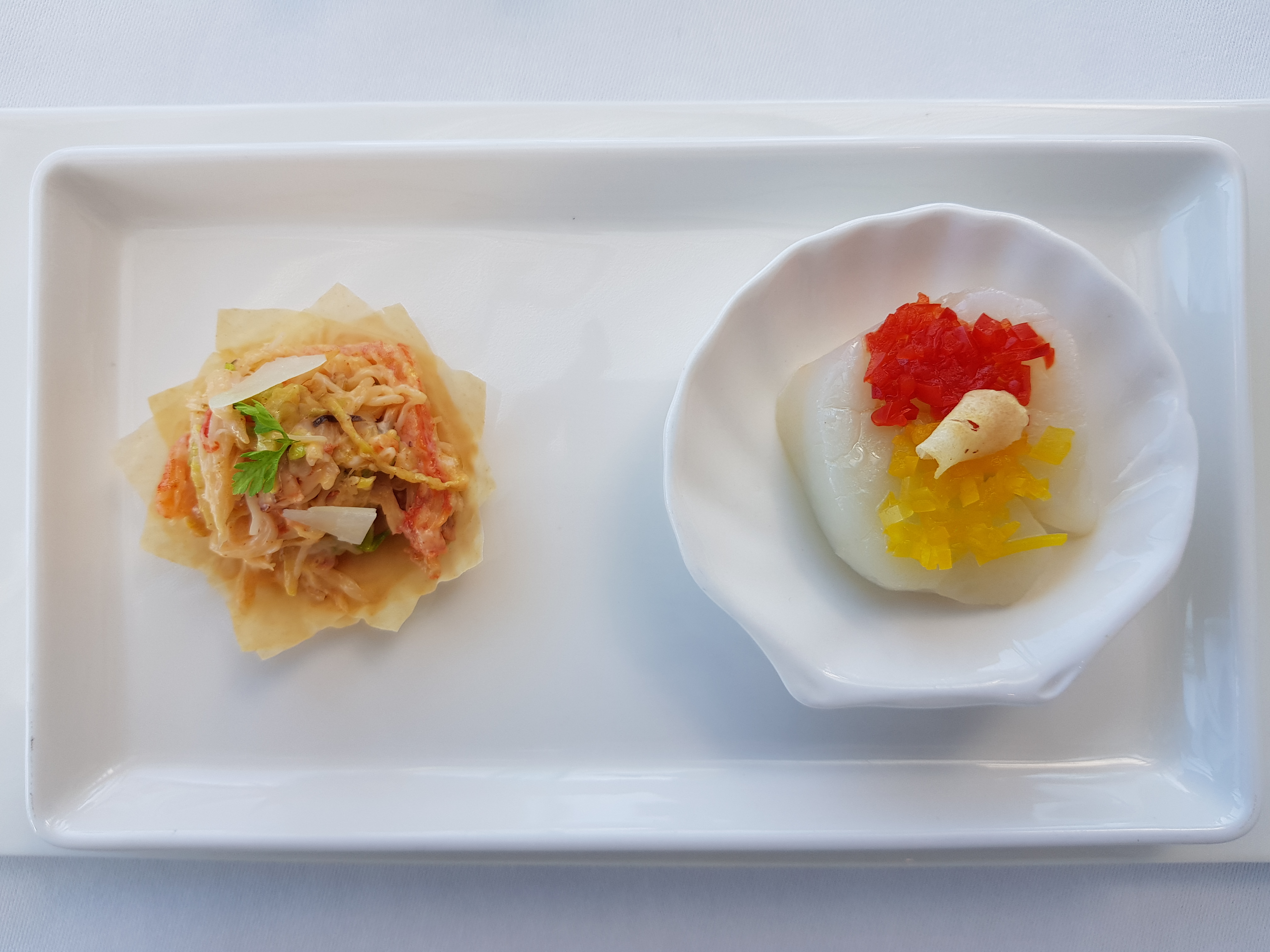 필로 페스츄리, 대게, 쵸리조, 방울 양배추, 파마산 치즈, 처빌, 관자, 완두콩 퓨레, 적양파, 파프리카 피클, 마늘칩이 들어있는 요리입니다. 이름이 정말 기네요 X) 한입에 넣어서 먹었습니다. 조개 요리를 별로 안 좋아하는데, 이건 비리지도 않고 담백해서 맛있더라고요! 대게를 좋아하는데 한입에 넣자마자 대게 맛이 확 나서 좋았습니다.