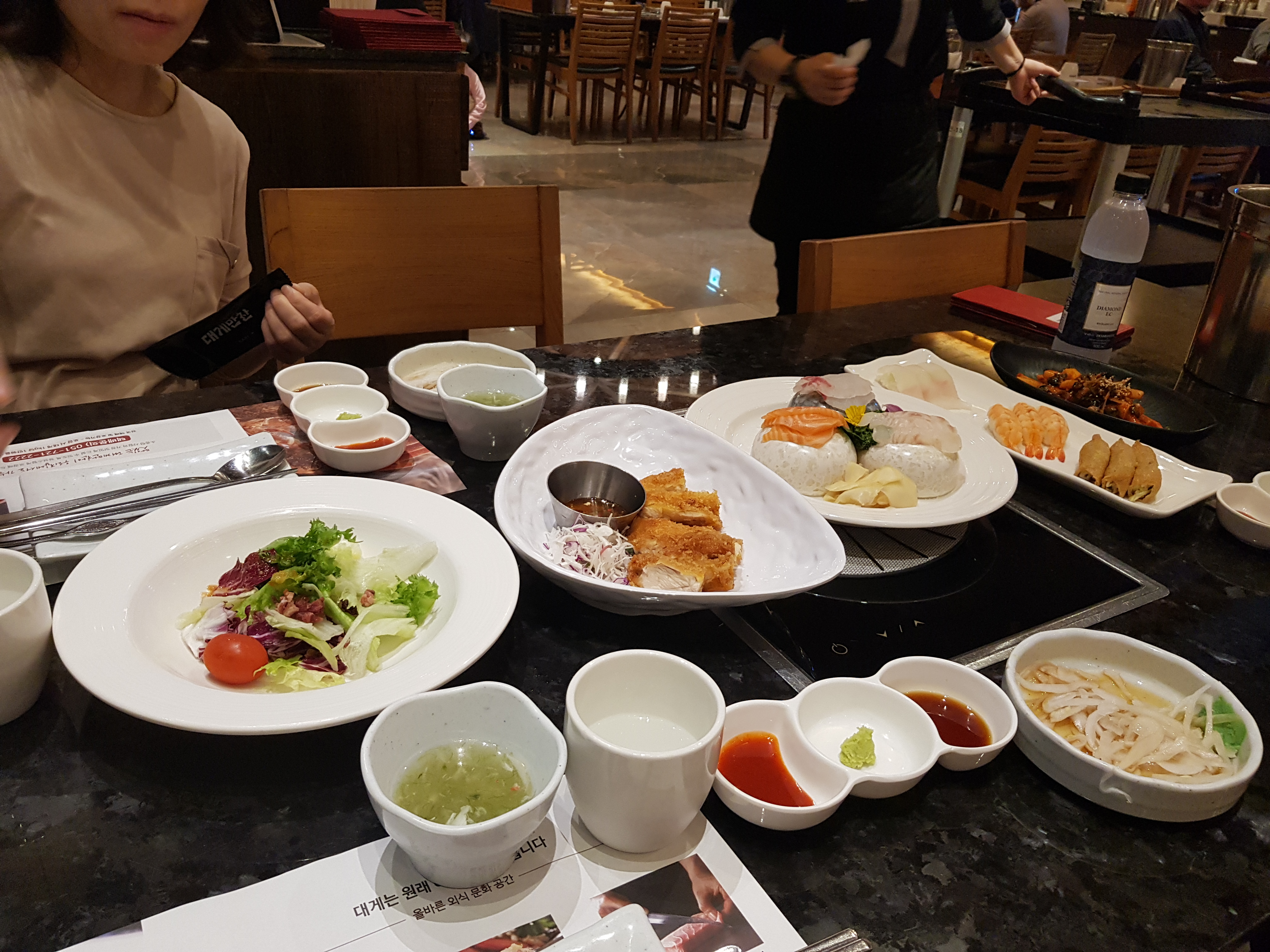 테이블에 앉아서 기다리면 샐러드, 초밥 등이 기본으로 제공됩니다.