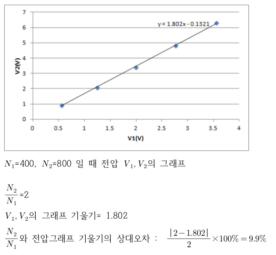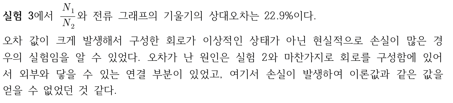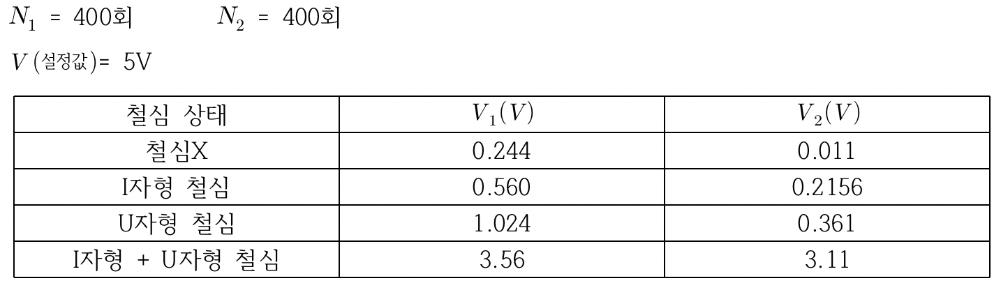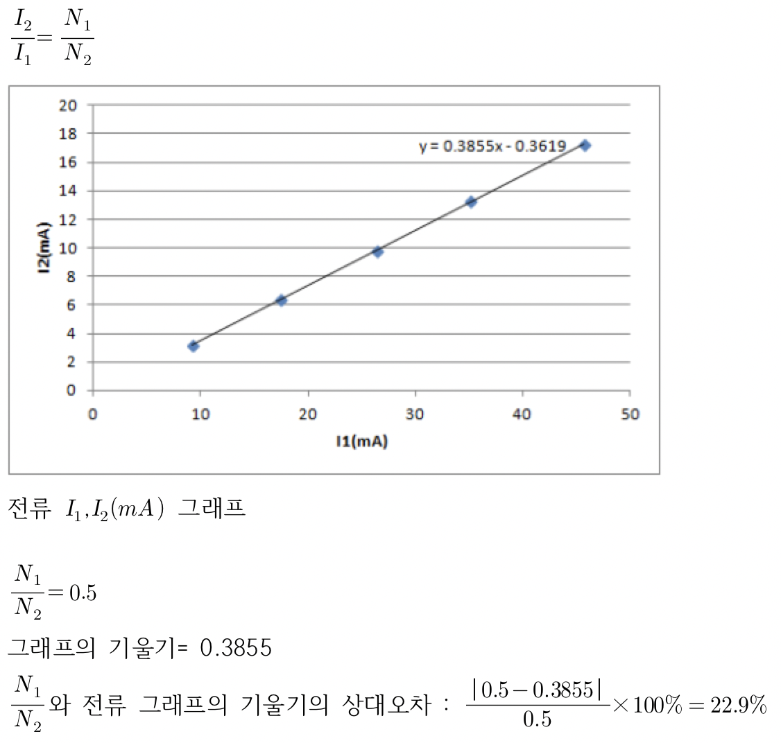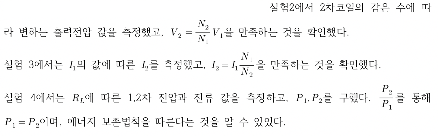 실험 1에서 철심 상태에 따라 철심이 없음부터 I자형 철심, U자형 철심, I자형+U자형 철심일 때의 1,2차 전압 값을 측정했다. I자형+U자형 철심일 때의 1차와 2차 전압 그래프의 기울기가 가장 1에 근사한 값을 보였다. 이 실험을 통해 철심은 자속이 발생되어 전달될 수 있는 역할을 한다는 것을 알 수 있었고, 코일과 코일사이에 철심의 공백이 없을수록 전달을 잘 하는 것을 알 수 있었다.