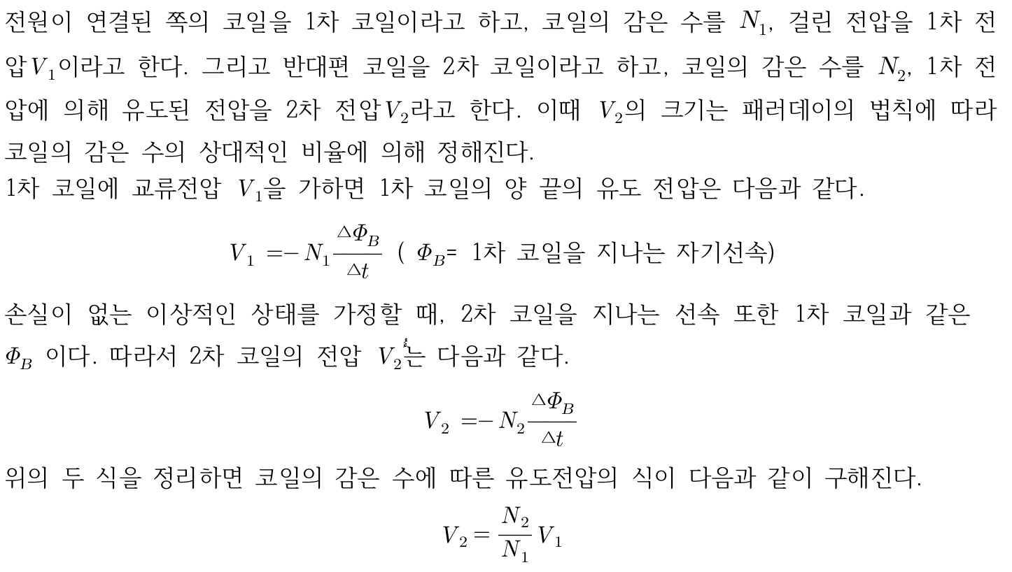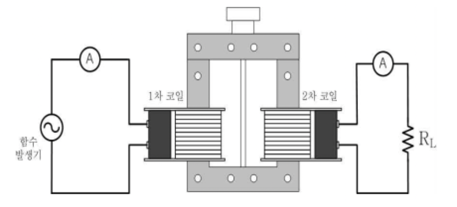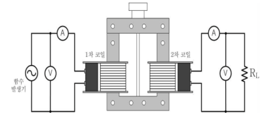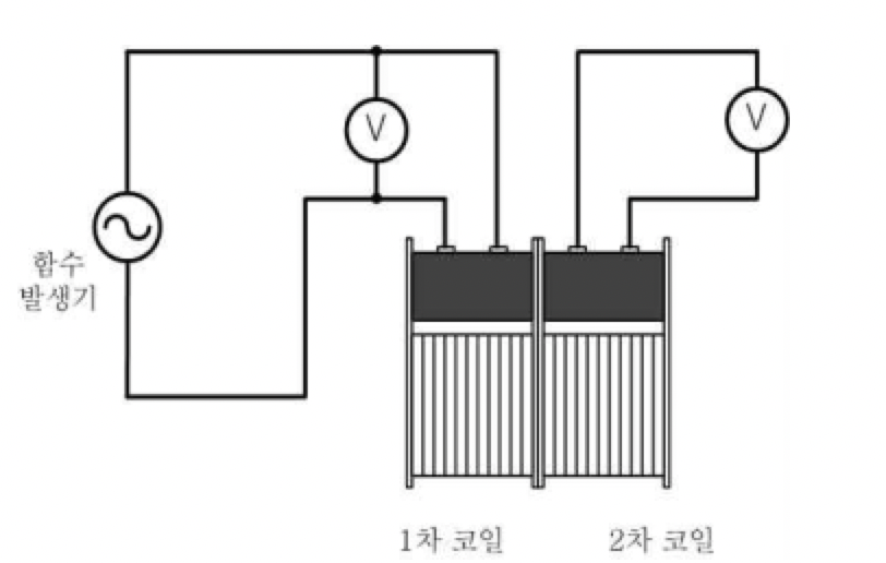 변압기란 전자기유도현상을 이용하여 교류의 전압이나 전류의 값을 변화시키는 장치이다. 변압기 코일의 2개를 연결해 한쪽에는 함수발생기를 연결하고 다른 한쪽에는 멀티미터를 연결한다. 전원을 연결한 코일에 전류가 흐르면 코일과 철심에는 자기장이 형성된다. 반대편 코일에는 교류전류가 유도된다.