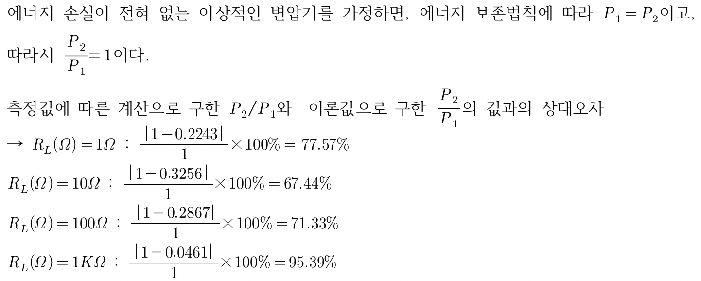 실험 4에서 이론값으로 구한 전력의 비는 변압기가 손실이 없는 매우 이상적인 상태를 가정하고 구한 값이었기 때문에 이 또한 실험 3처럼 손실이 많은 경우의 실험을 보였다. 또한 이 실험은 앞의 실험들보다 복잡한 회로 연결을 요했고 이에 따라 더 많은 노출 부위를 보여 더 큰 손실이 있었던 것 같다.