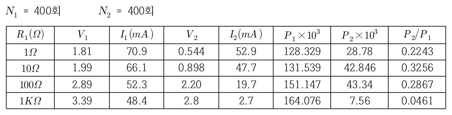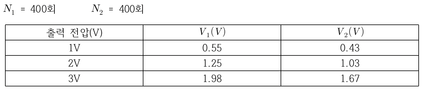 1. 1,2차 코일을 400회 코일 2개로 택하고 변압기 코일의 사이에 I자형 철심을 사용해 연결한다.