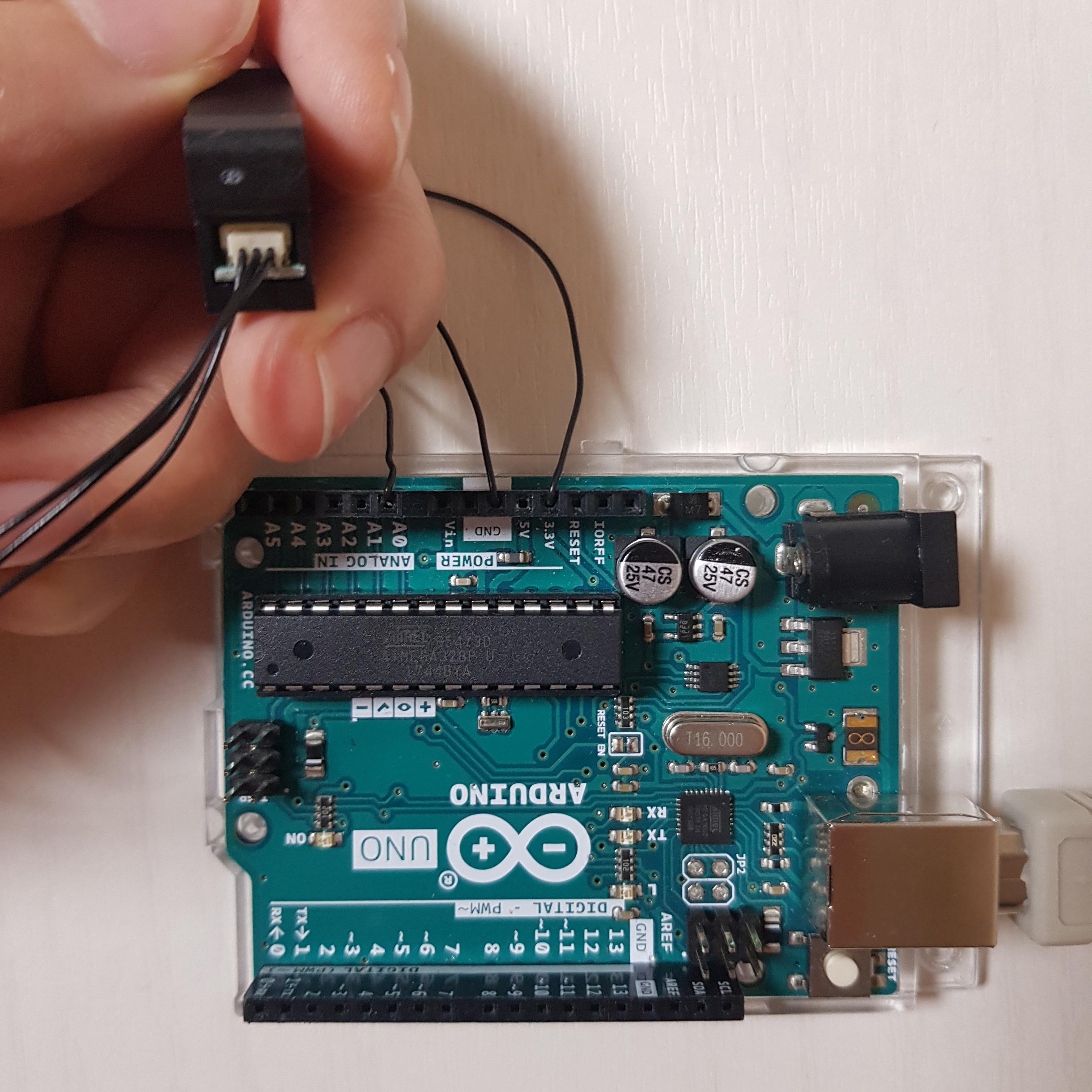 GND는 아두이노 GND에, Vout은 아두이노 A0에, Vcc는 아두이노 3.3V핀에 연결해줬습니다.