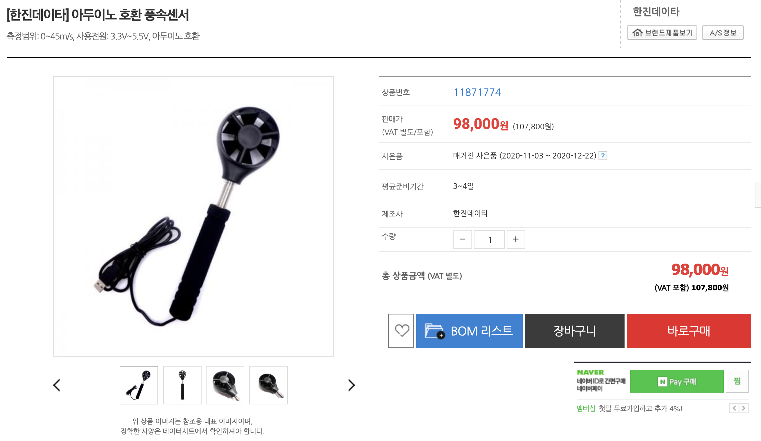 아두이노 센서 중에 바람을 측정하는 풍속 센서는 찾기 힘들었습니다. 디바이스 마트에 아두이노 호환 풍속 센서로 판매하는 제품이 있긴 한데, 98000원이라는 사악한 가격으로 판매되고 있습니다. 45m/s까지 측정이 가능하나 너무 비싼 가격 때문에 이것으로 시제품을 만들기에는 무리가 있었습니다.