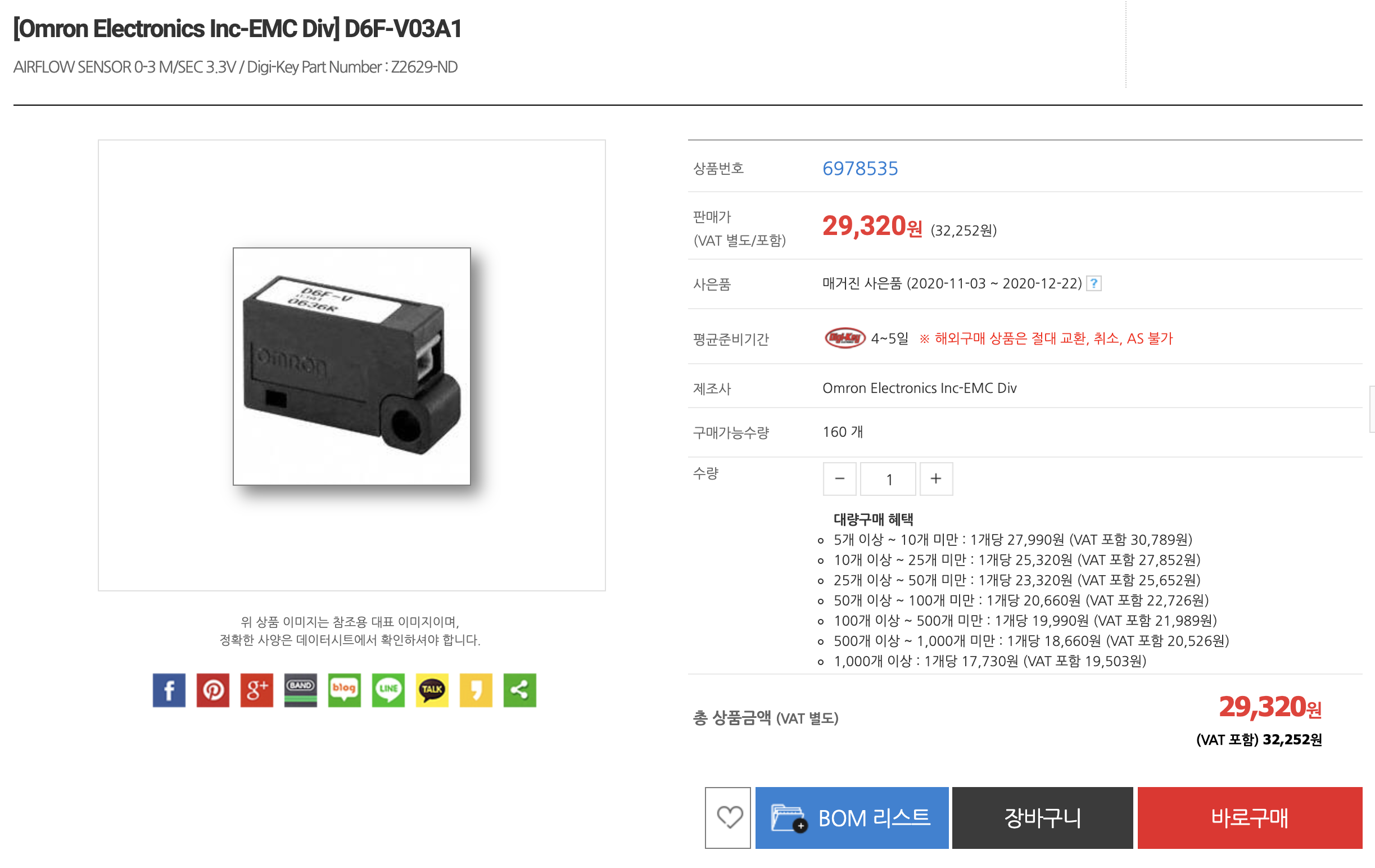 다른 풍속 센서를 찾다가 오므론(Omron)이라는 외국회사에서 만든 D6F-V03A1이라는 유량 센서를 발견했습니다. 3만원대이고 3m/h까지 측정되지만 일단 시제품 만들기엔 적합한 것 같아서 구매했습니다.
