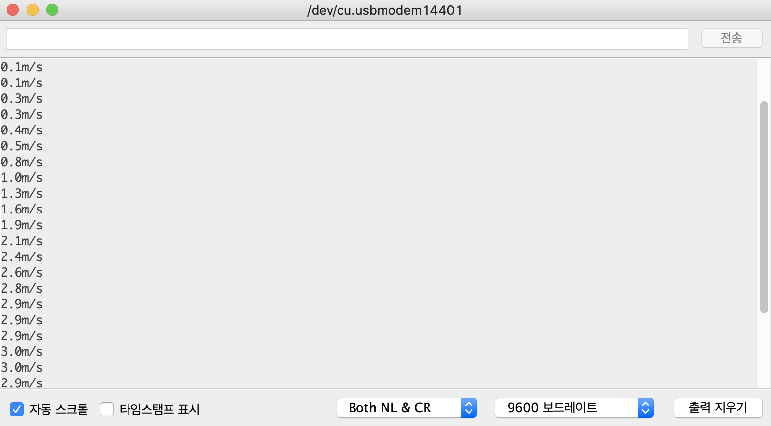 0.5초에 한 번씩 센서 값이 찍히는 걸 확인할 수 있었습니다.