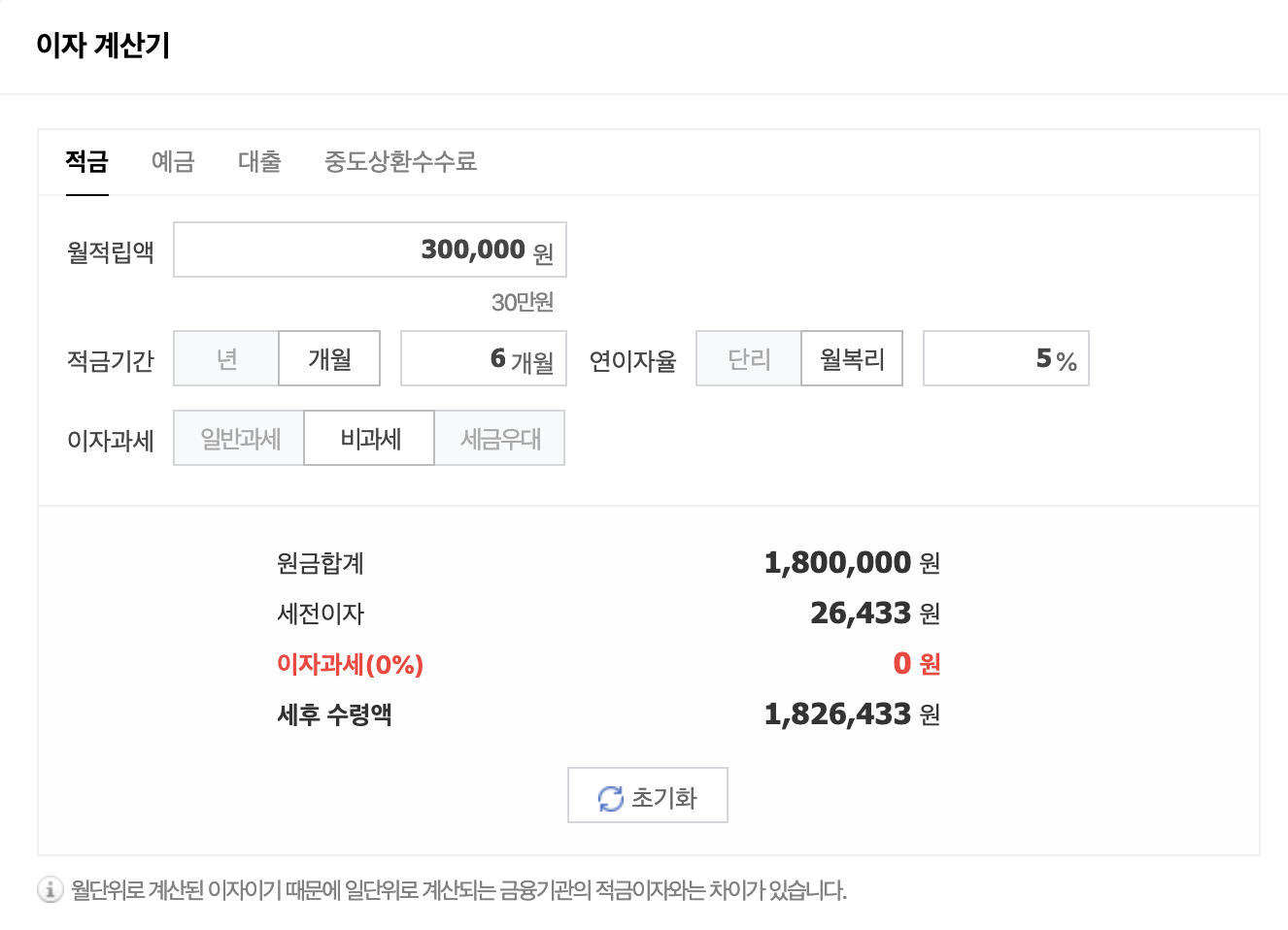 네이버 이자 계산기를 사용해 월복리로 계산한 금액과 들어온 이자가 정확하게 일치합니다. 없는 돈 긁어모아서 납입했는데 이자소득이 있어서 기분이 좋네요:)
