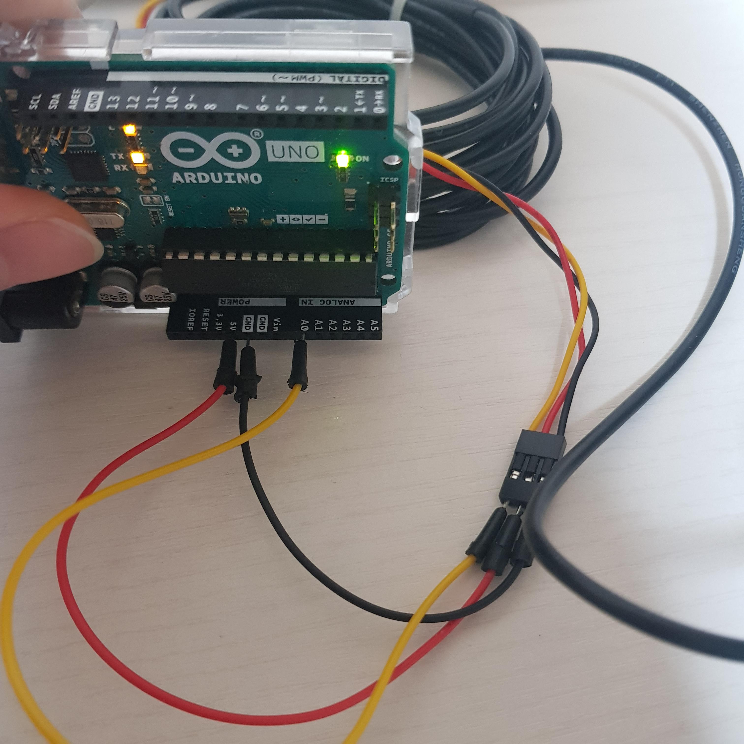 빨간 선은 아두이노 5V에, 검은선은 아두이노 GND에, 노란선은 아두이노 A0에 연결해주세요.