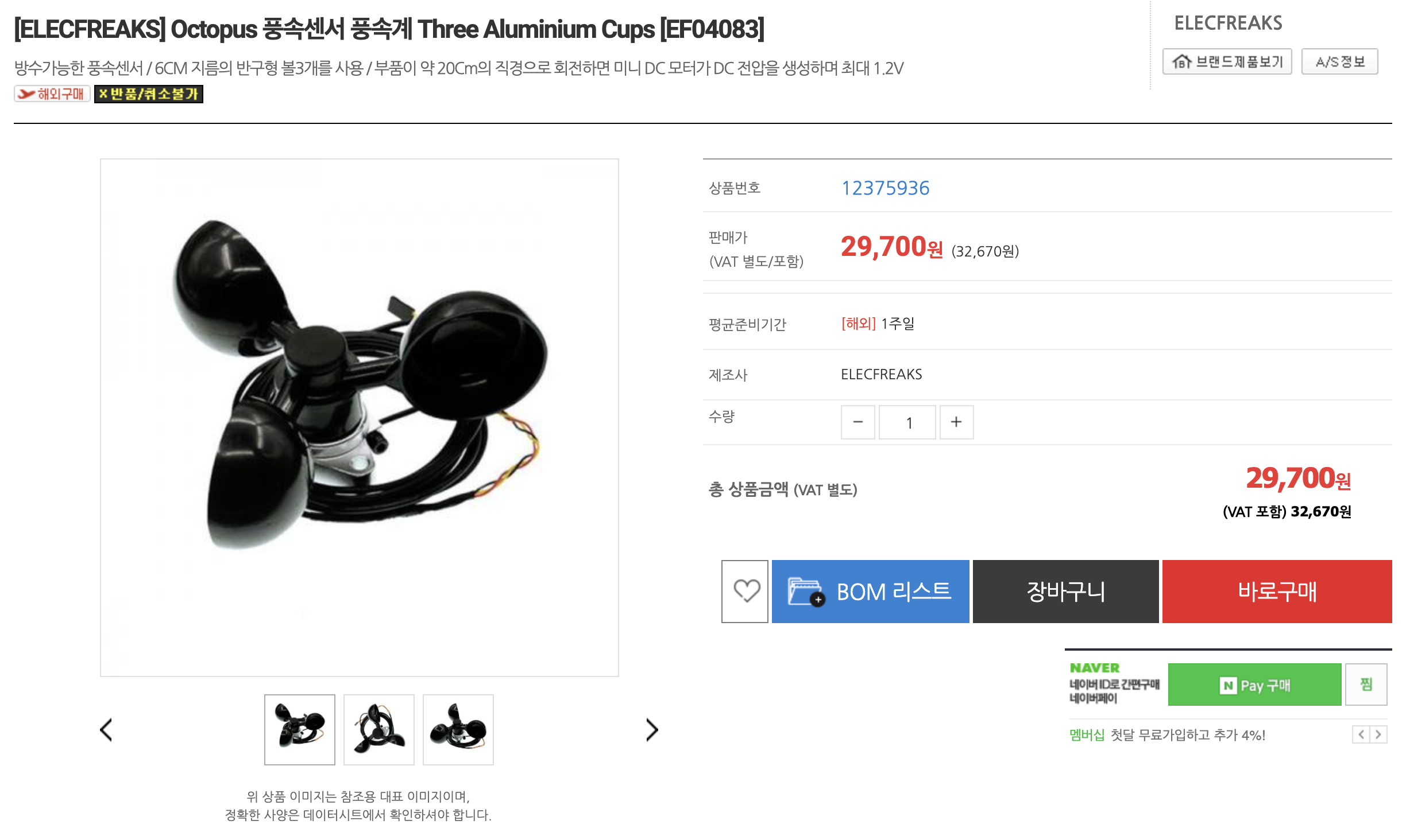 디바이스 마트에서 ELECFREAKS사의 Octopus 풍속 센서를 구매하였습니다. 디바이스 마트에서의 풀네임은 "[ELECFREAKS] Octopus 풍속 센서 풍속계 Three Aluminium Cups [EF04083]"네요. 3만원 조금 안 되는 비싸고 큰 센서입니다.