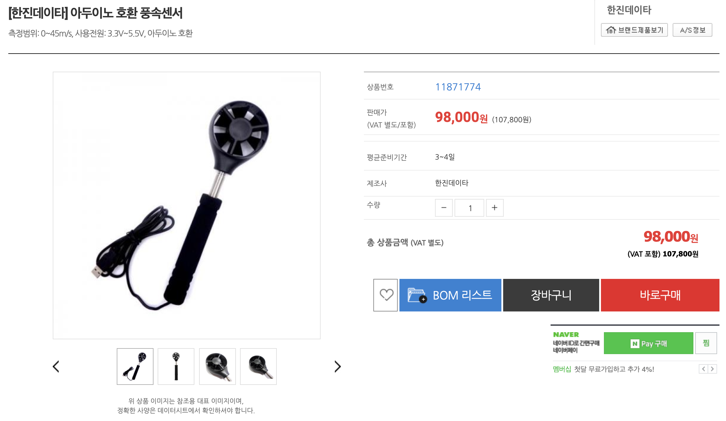 한진데이타의 아두이노 호환 풍속 센서를 구매했습니다.