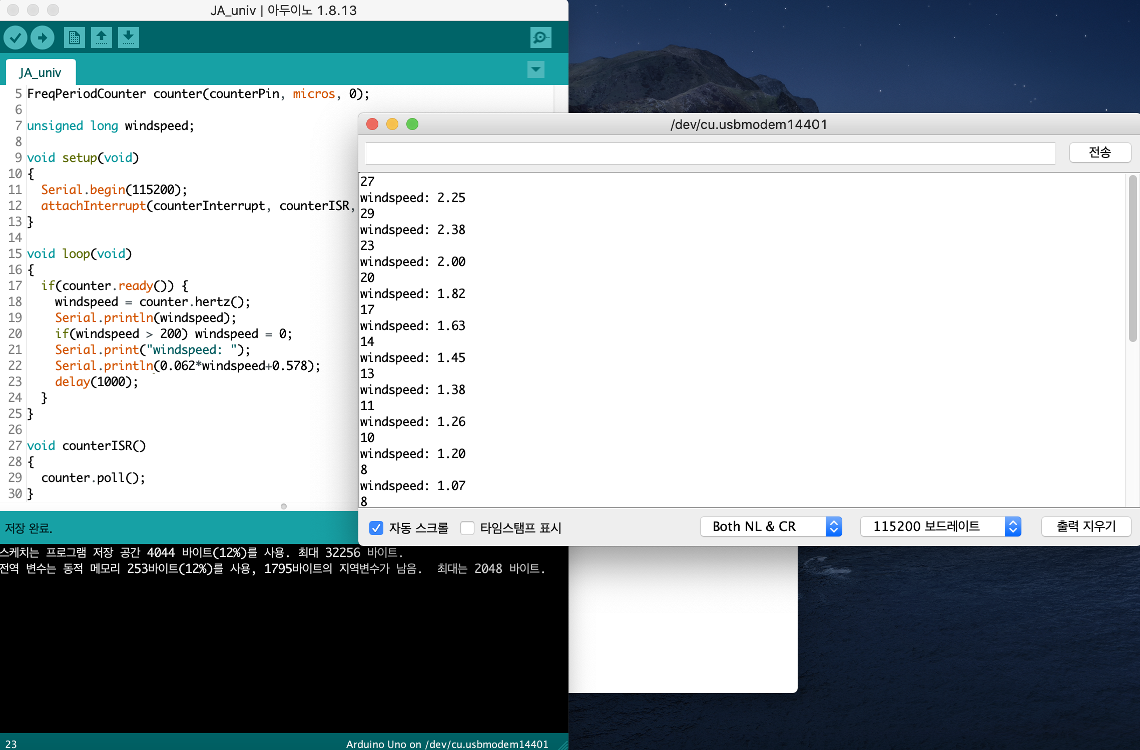 풍속 센서의 날개가 멈춰있는 상태에서는 주파수값이 200이하이므로 아무것도 출력되지 않습니다. 하지만 입으로 살짝 바람을 불어서 풍속센서 날개가 돌아가면 아래와 같이 주파수, 풍속 값이 출력이 됩니다.
