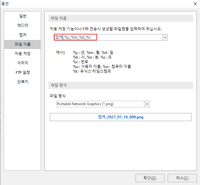 저는 파일 이름 자동 저장을 "캡쳐_%y_%m_%d_%c"로 해서 캡쳐_2021_01_06_000.png, 캡쳐_2021_01_06_001.png로 저장되게 만들었습니다. 이 기능 덕분에 빠르게 여러 장을 캡쳐해야할 때, 이름 저장을 고민할 필요가 없어졌습니다.