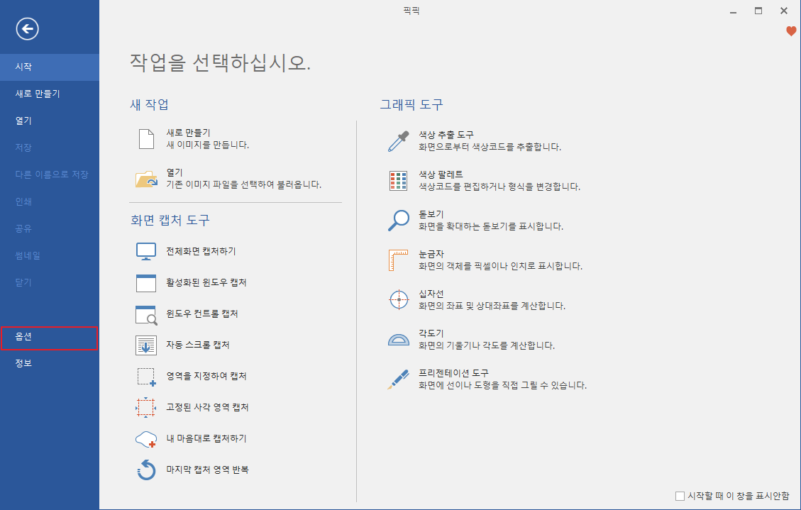 픽픽이 정상적으로 설치되었다면 위와 같이 창이 뜹니다. 왼쪽 메뉴에서 옵션을 선택해서 단축키 지정 등 커스터마이징을 할 수 있습니다.