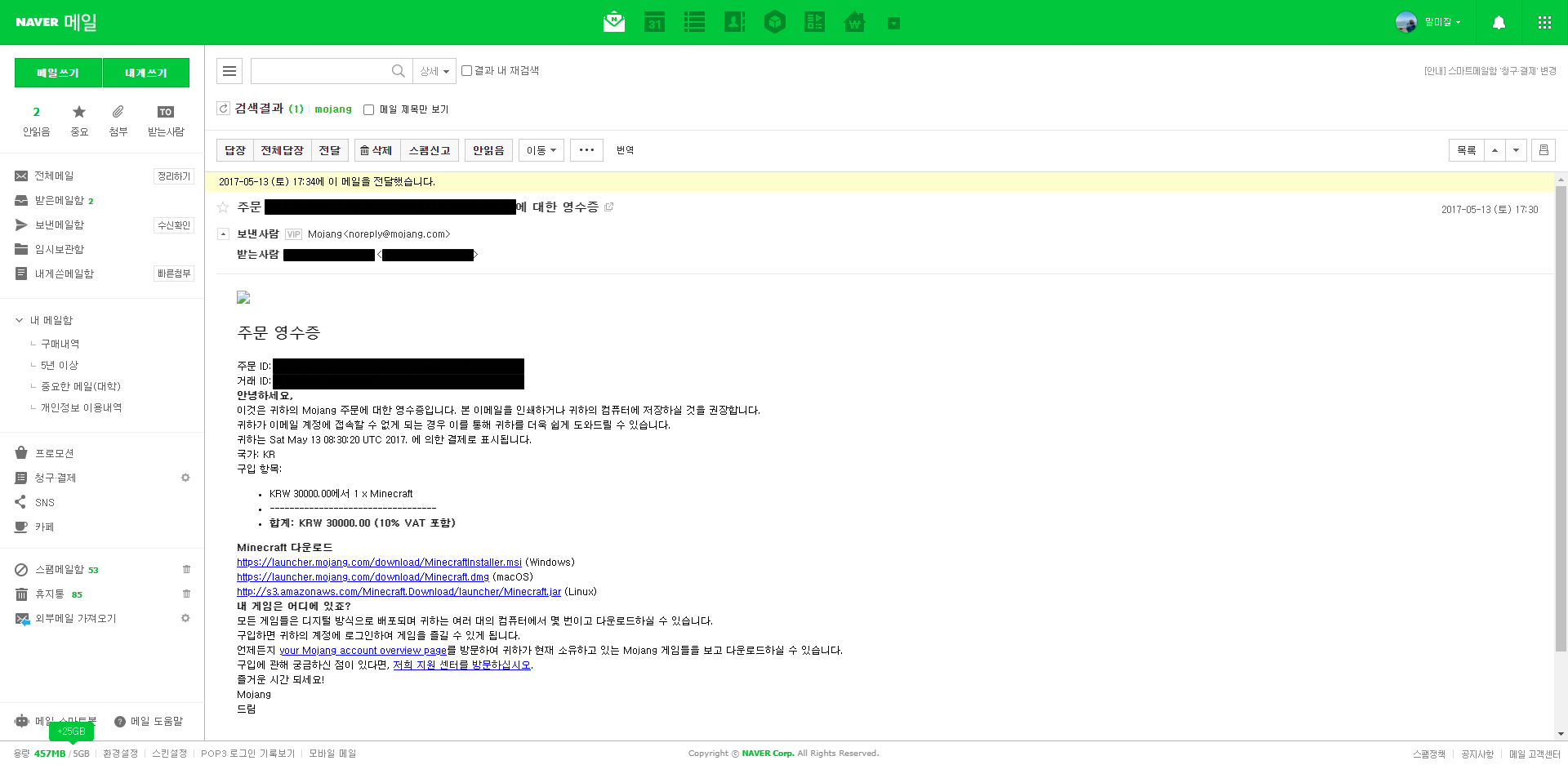 구매를 하면 연결된 이메일에 메일이 날라옵니다.