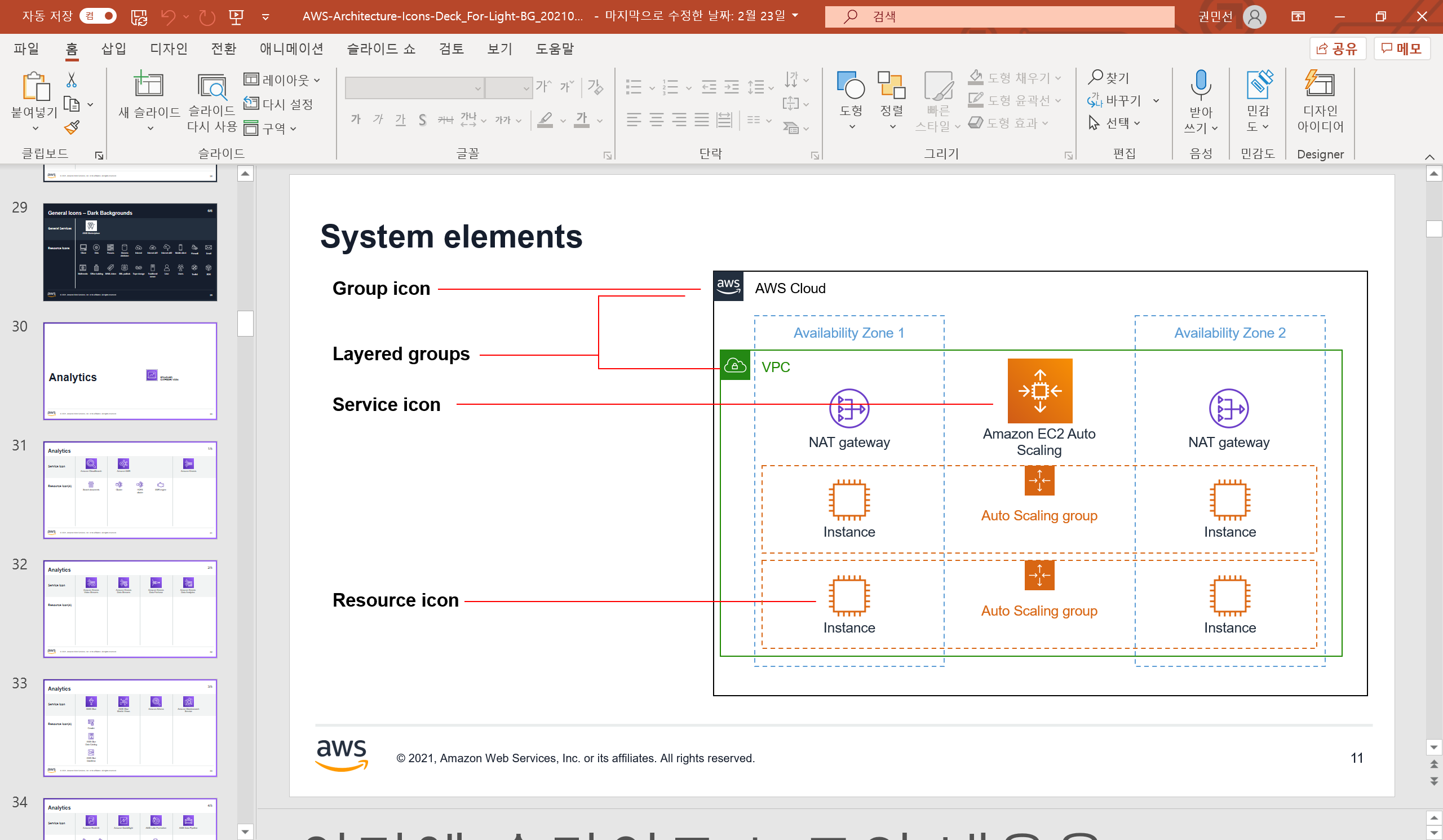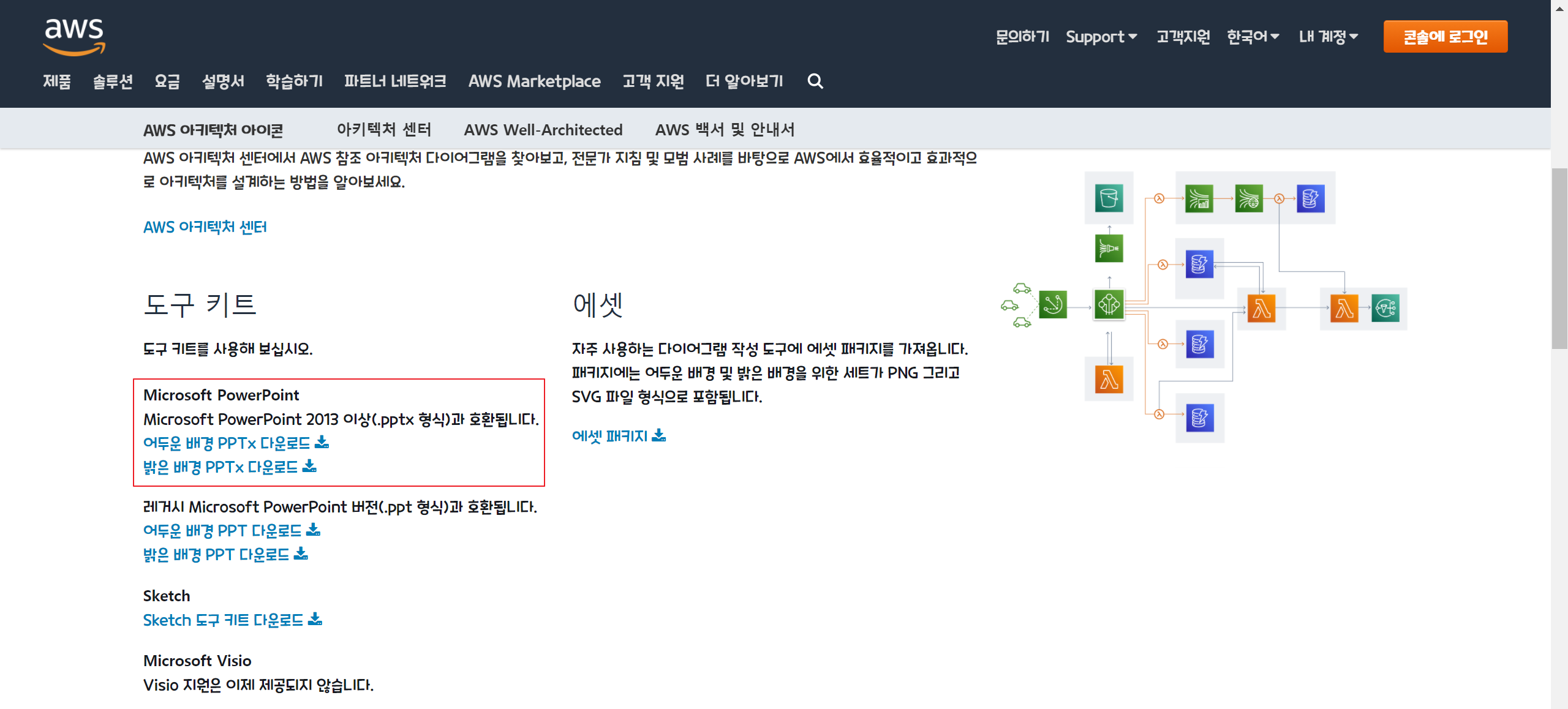 AWS에서 제공하는 모든 서비스에 대한 아이콘부터, 선들과 그룹 아이콘까지 모두 있었습니다. AWS 아키텍쳐 그리는 가이드도(글로) 제공하고 있었습니다.