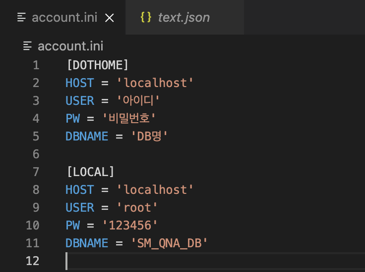 저는 웹 호스팅을 하는 서버가 따로있고, 그와 비슷한 환경으로 Local 서버를 구축했습니다. 그래서 account.ini에 [DOTHOME], [LOCAL]이라는 섹션 두개를 만들고, 각 서버에서 DB에 접속하기 위한 HOST, USER, PW, DBNAME을 저장했습니다.