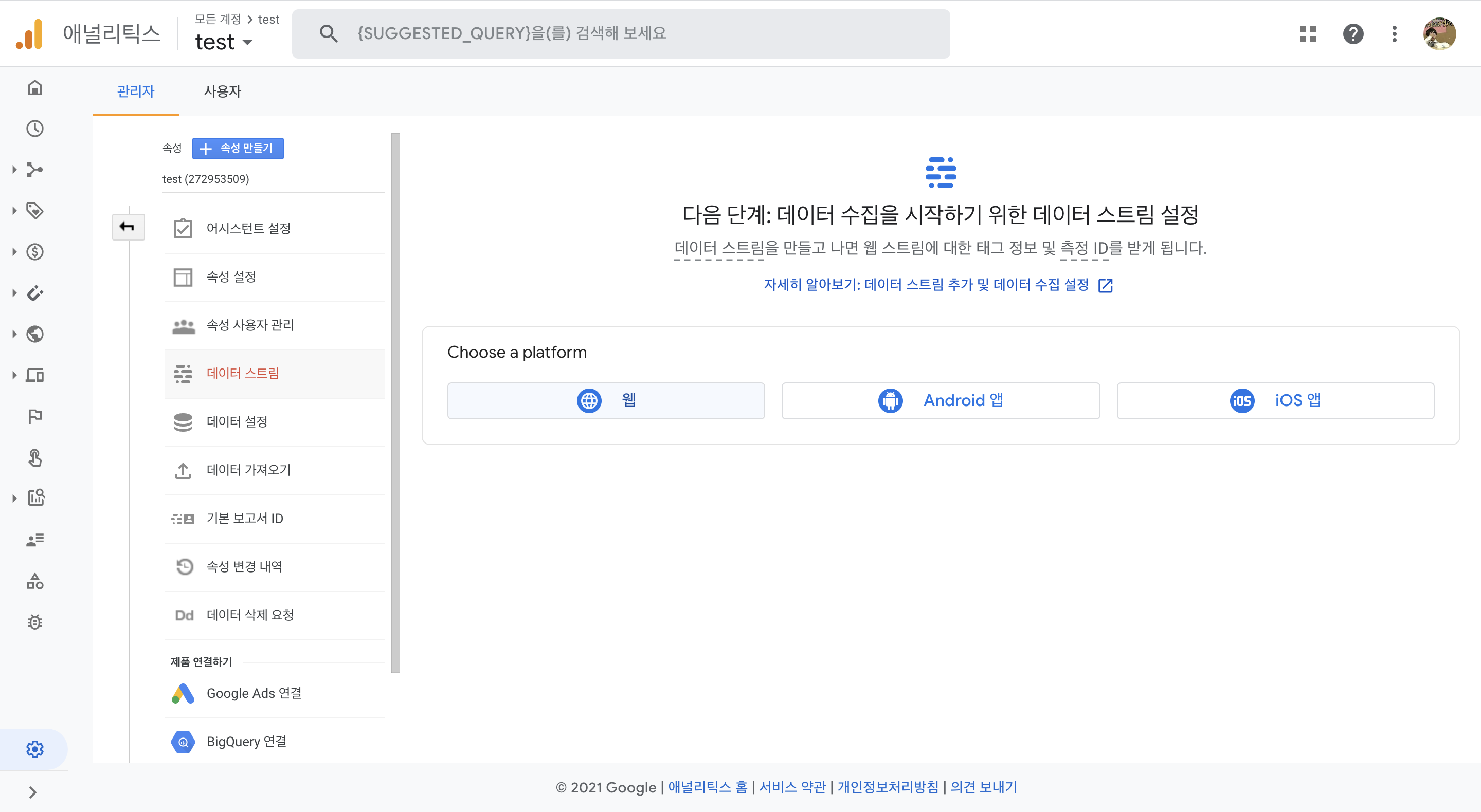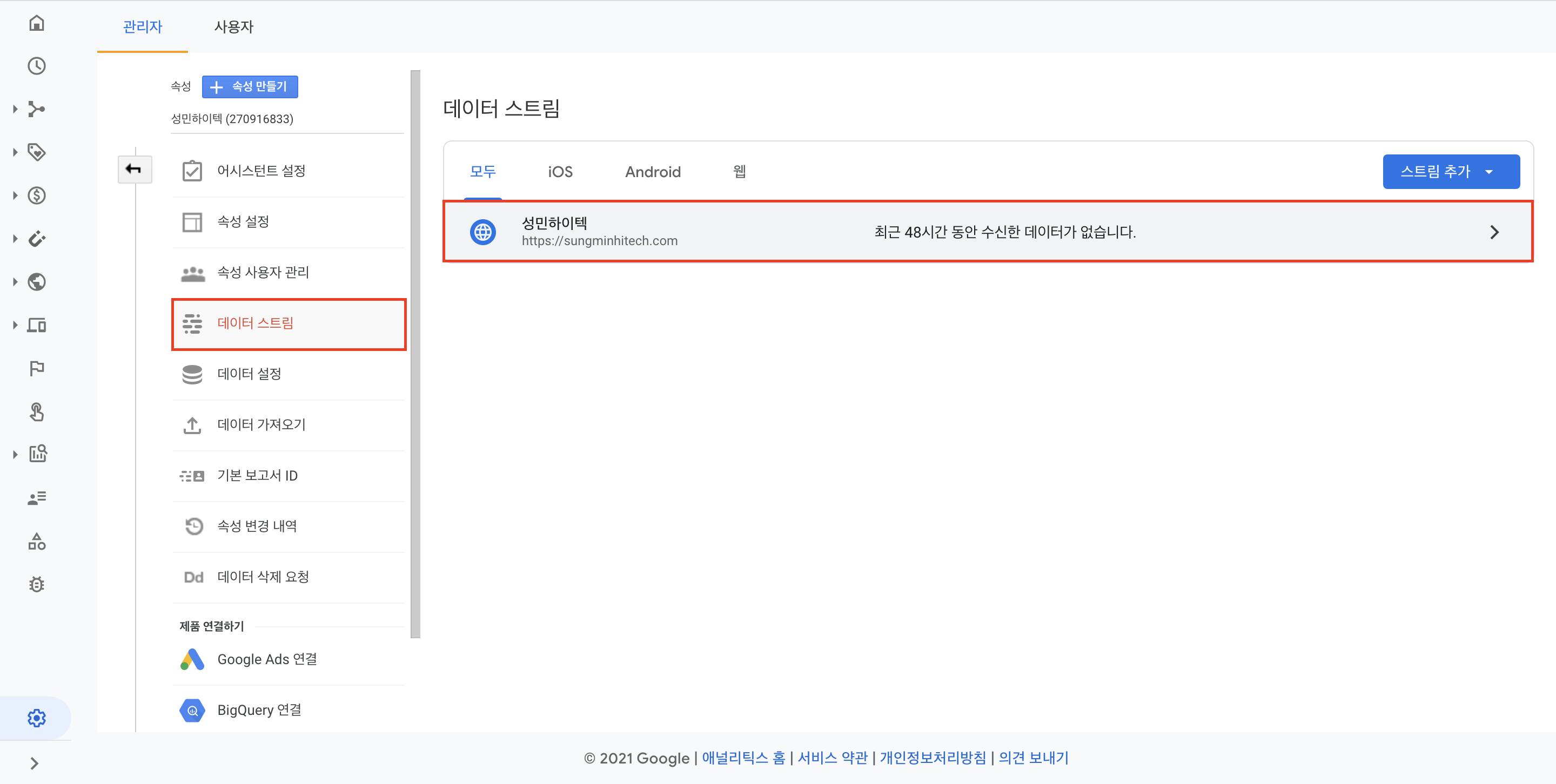 여기까지 하면 데이터 스트림이 생성되고, 추적 코드가 만들어집니다. 관리자 페이지>데이터 스트림에서 데이터 스트림 리스트를 확인합니다.