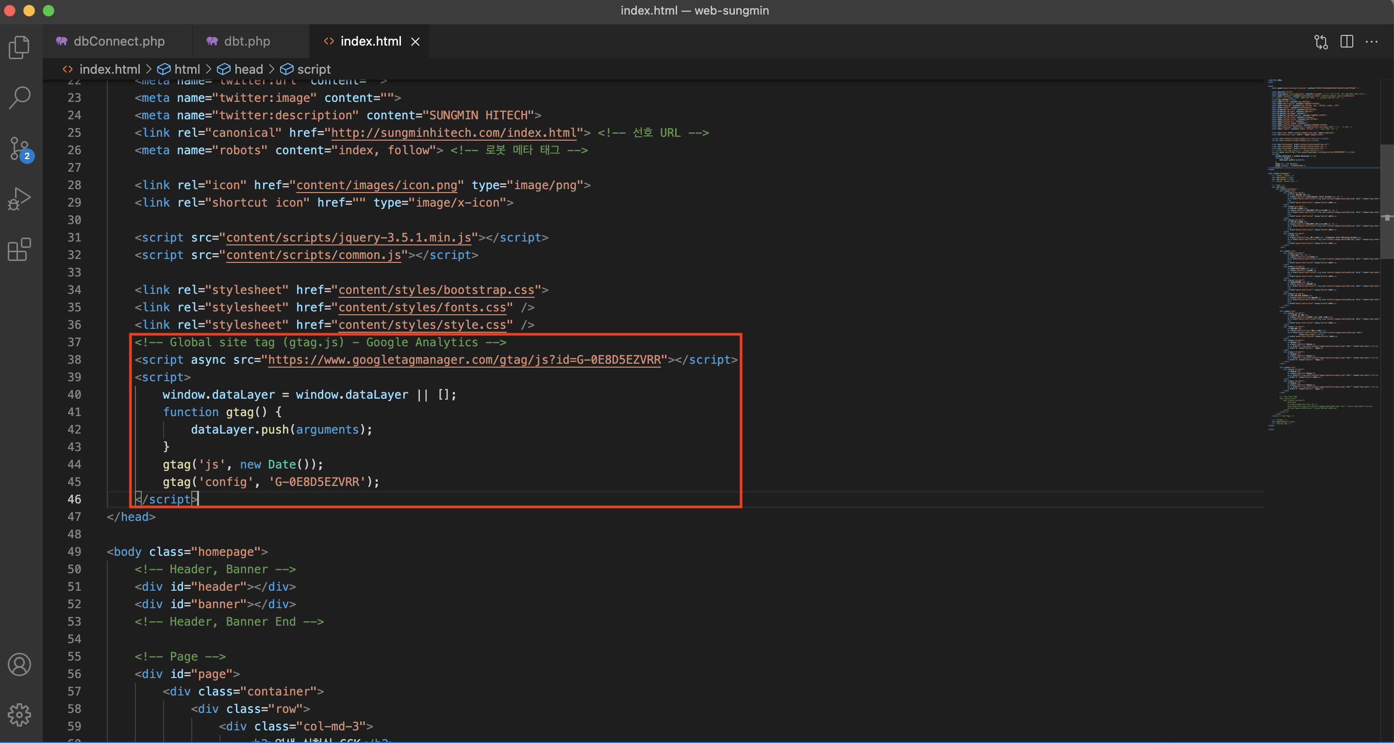 추적 코드를 복사해서, 원하는 페이지의 HTML 파일에 붙여 넣기 해줍니다. 저는 index.html파일의 head안에 삽입해줬습니다. 복붙한 코드 그대로 붙여 넣으시면 됩니다.