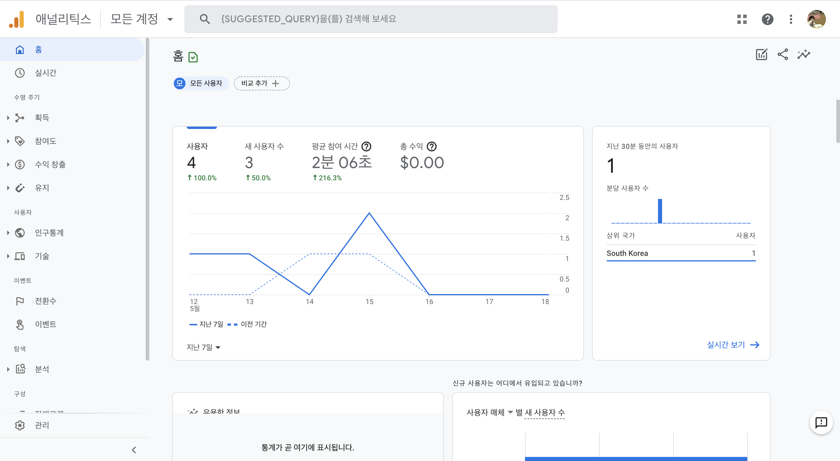 이제 구글 애널리틱스에서 방문자 수 추적을 위한 설정이 모두 끝났습니다. 추적이 잘 되고 있는지 확인하려면 방문자가 발생해야 하는데, 제 사이트는 하루에 10명 내로 방문하는 소소소소규모 사이트라서 추적이 되는지 확인하는데 조금 시간이 걸렸습니다😥 아래는 오늘 제가 캡쳐한 애널리틱스 홈 화면입니다.