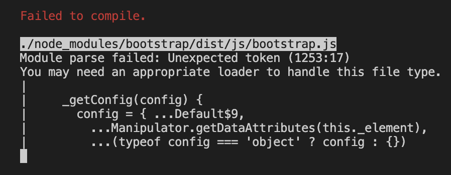 React에서 Bootstrap을 사용하는 방법을 검색하면 npm install boostrap으로 설치한 후 import를 하라는 글이 많았습니다. 제대로 된 설명이 없어서 당연히 index.js에 bootstrap.js를 import 하면 되겠지 했지만 아래와 같은 에러가 발생했습니다.