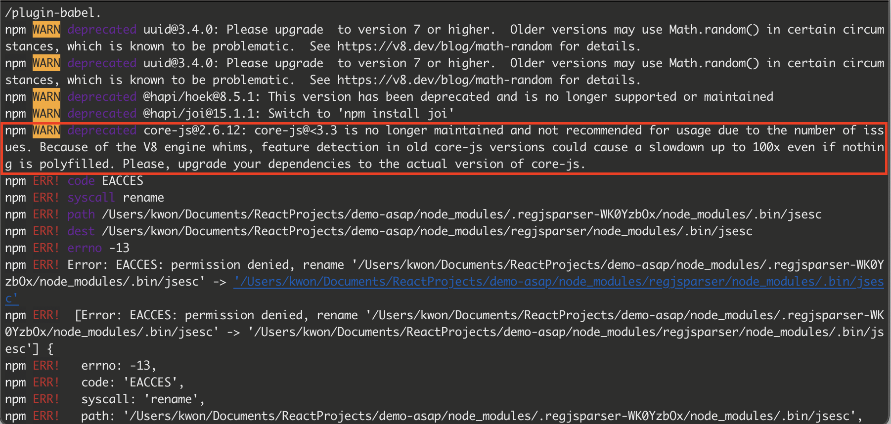 npm WARN deprecated core-js@2.6.12: core-js@<3.3 is no longer maintained and not recommended for usage due to the number of issues. Because of the V8 engine whims, feature detection in old core-js versions could cause a slowdown up to 100x even if nothing is polyfilled. Please, upgrade your dependencies to the actual version of core-js.