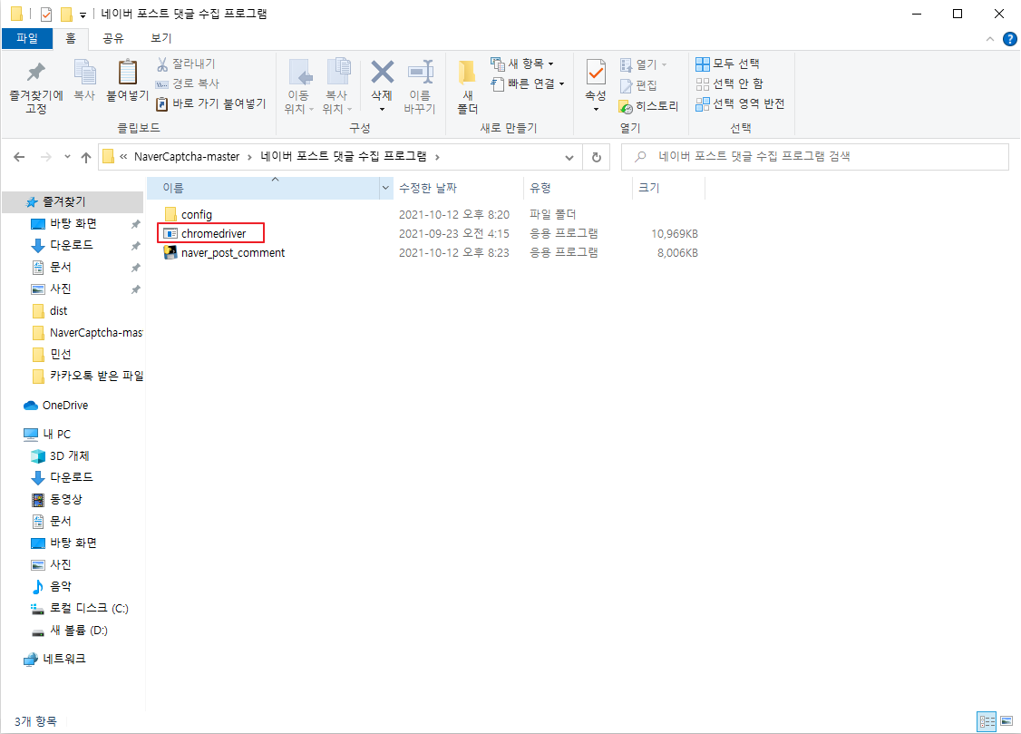 1. 다운받은 프로그램의 압축을 해제하고, 폴더 안에 ChromeDriver.exe를 복붙 합니다.
