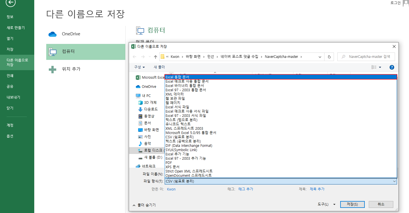 - 해당 파일은 csv파일입니다. 엑셀의 다양한 기능을 사용하고 싶다면 Excel 통합 문서 확장자여야 합니다. 다른 이름으로 저장 기능을 사용하면 Excel 통합 문서로 변경할 수 있습니다.