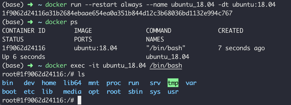 docker run --restart always --name ubuntu_18.04 -dt ubuntu:18.04 // ubuntu 설치