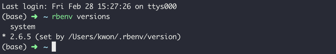 rbenv versions를 실행했을때 위 처럼 2.6.5앞에 *이 있어야합니다.
