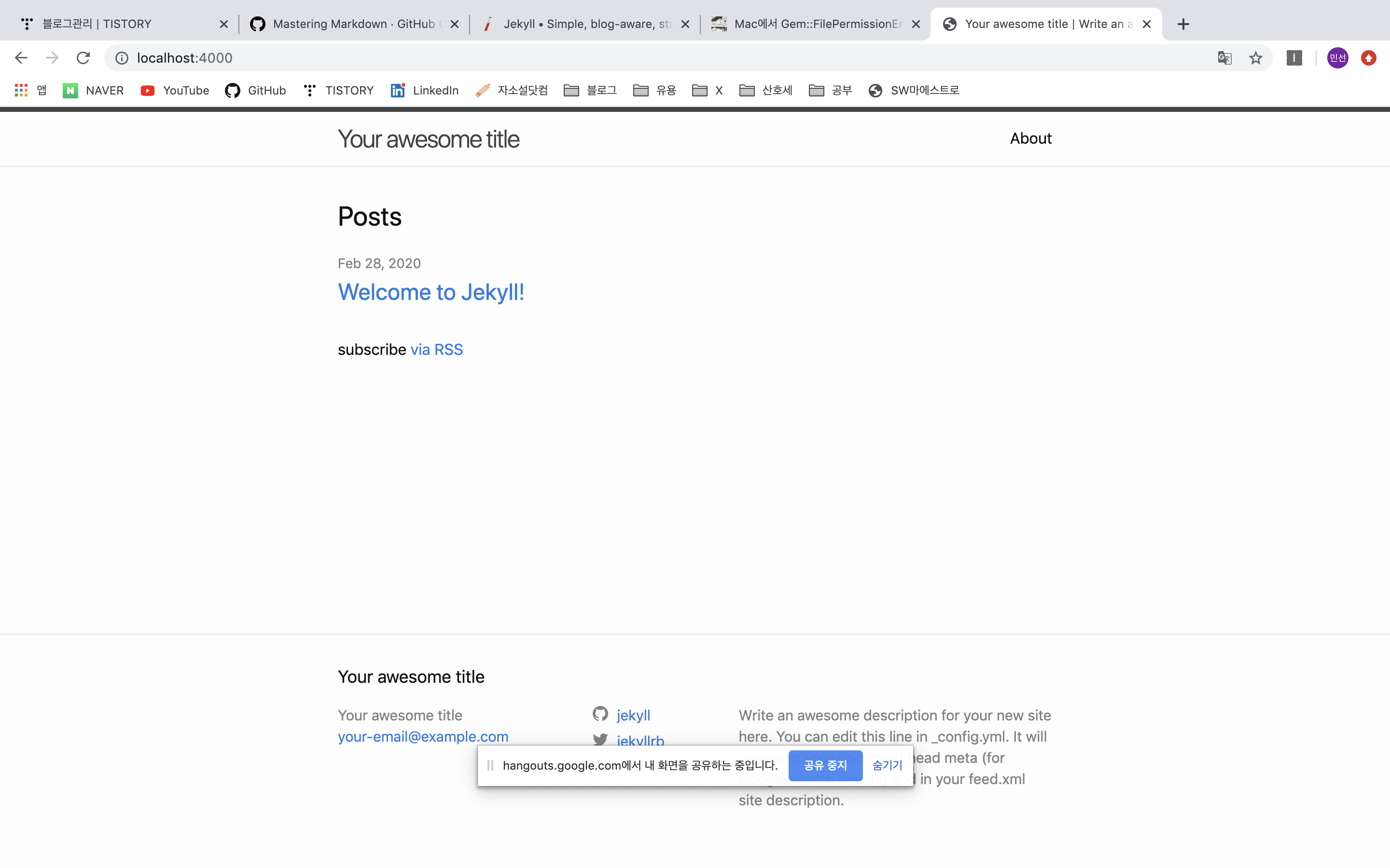 로컬 컴퓨터에서 jekyll을 돌리는데 성공했습니다:D
