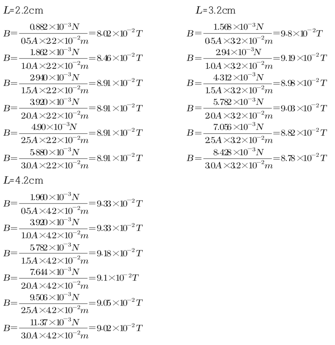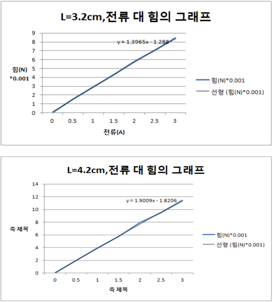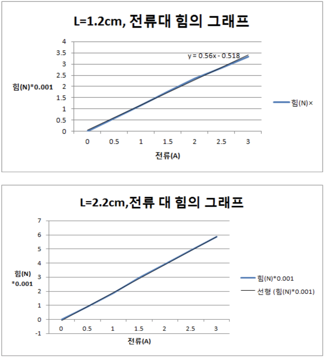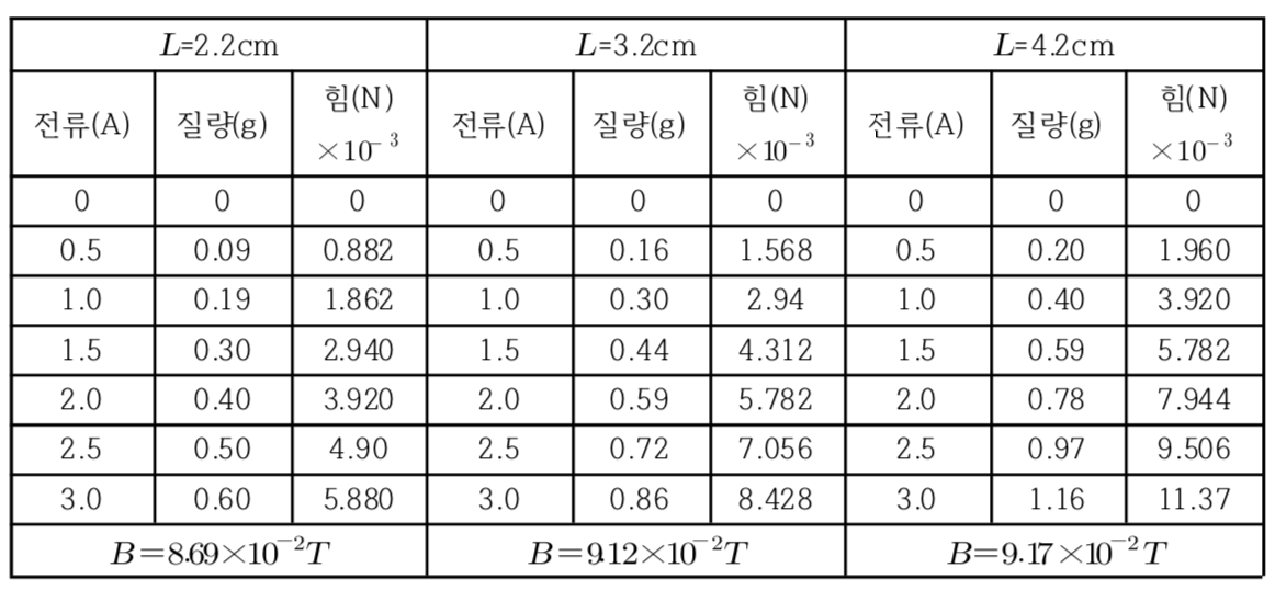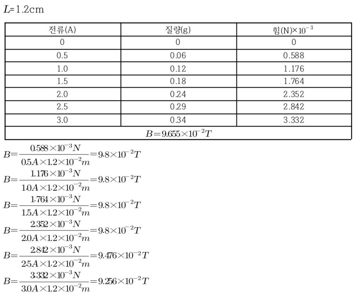 이론에 따라 실험을 통해 얻은 힘과 전류간의 그래프는 직선함수이며 기울기는 B*L이다.