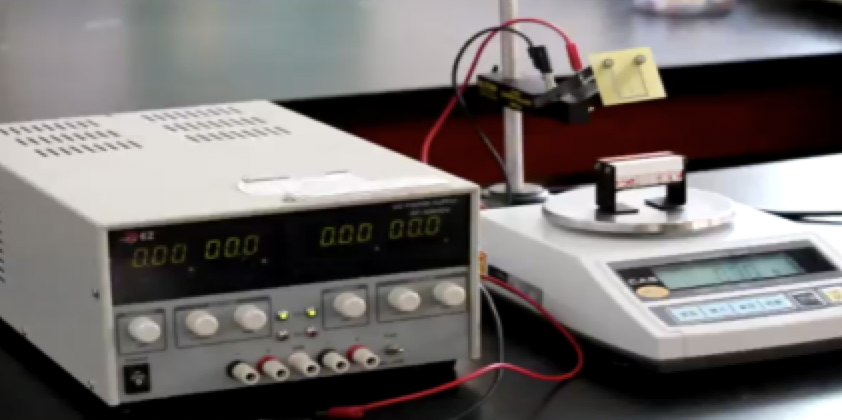 - 전류를 0A로 조절하고 저울의 ‘용기’ 버튼을 눌러 저울 눈금이 0이 되게 한다.