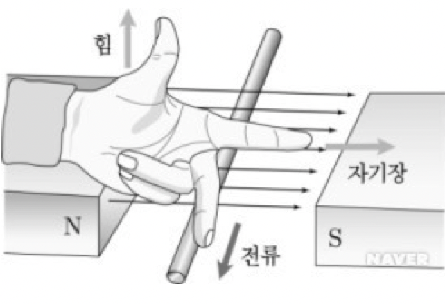 위에서 보는 바와 같이 왼손의 첫째, 둘째, 셋째 손가락을 서로 수직이 되게 폈을 때 둘째 손가락이 가르키는 방향이 자석에 의한 자기장의 방향이 되고 셋째 손가락이 가르키는 방향이 전류가 흘러가는 방향이 되며 이 때 첫째 손가락이 가르키는 방향이 자기력의 방향이 된다.