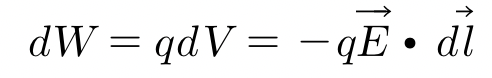 전기장 E 하에서 전하 q를 한 점에서 다른 점으로 dt 만큼 이동시키는데 필요한 일 dW는 다음과 같다.