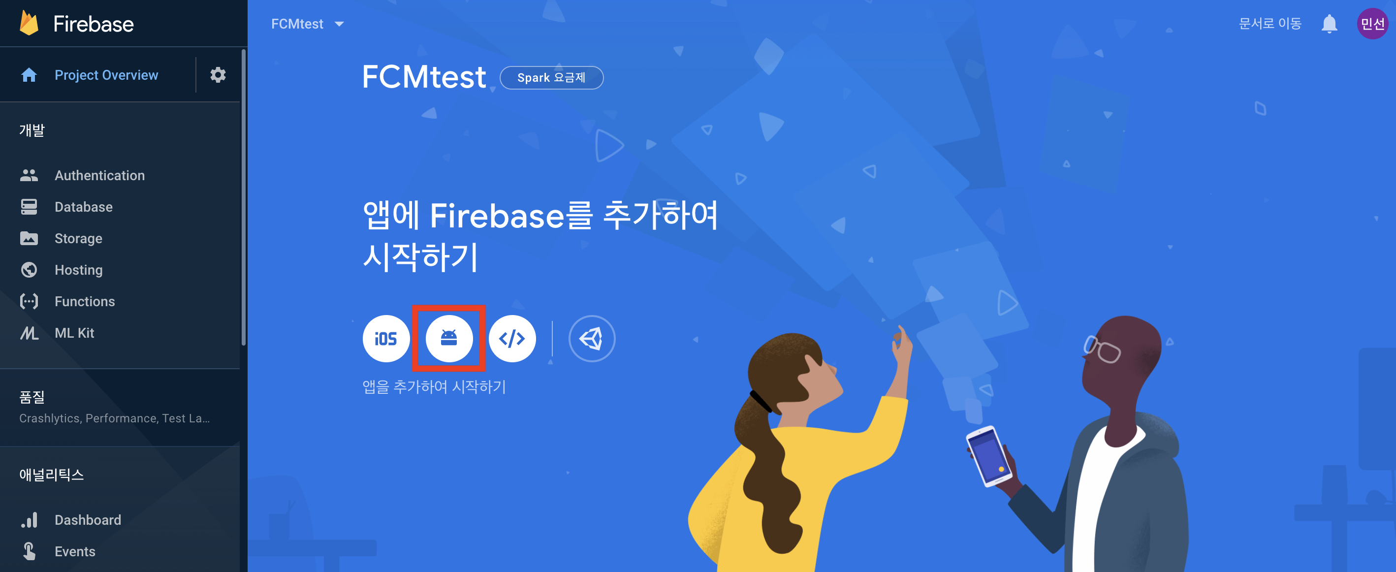 앱에 Firebase를 추가하여 시작하기에서 안드로이드 아이콘을 클릭해주세요.