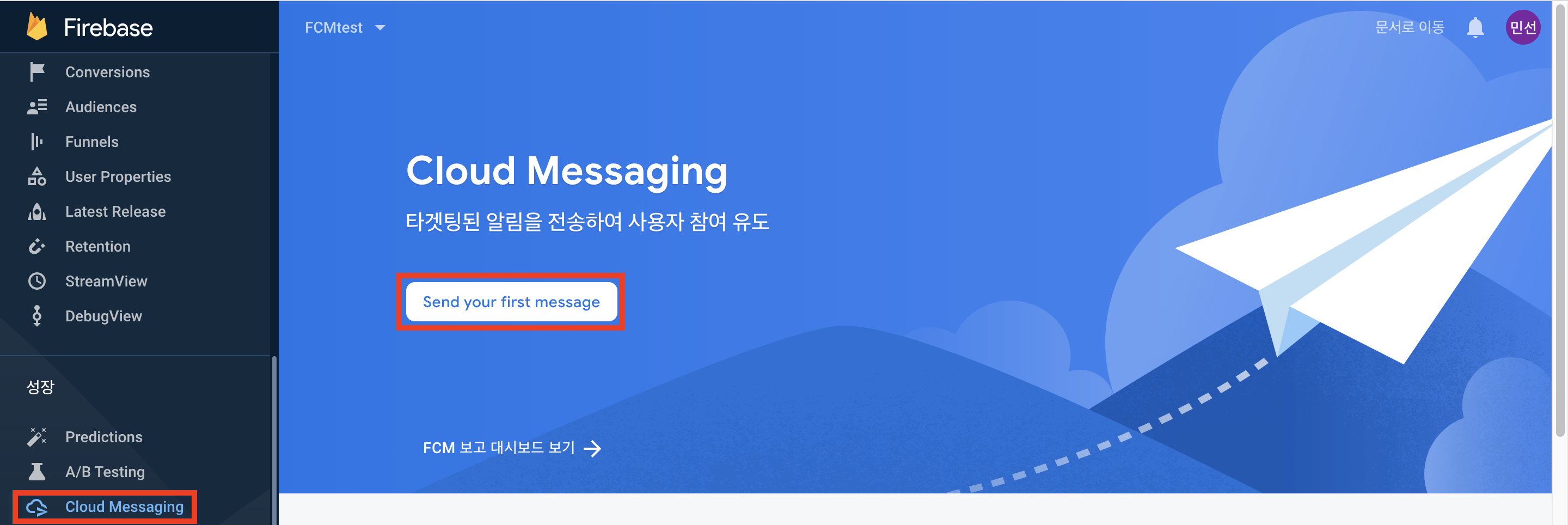 Firebase콘솔에 가서 성장>Cloud Messaging으로 가서 Send your first message를 클릭합니다.