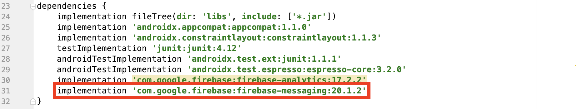 implementation 'com.google.firebase:firebase-messaging:20.1.2'