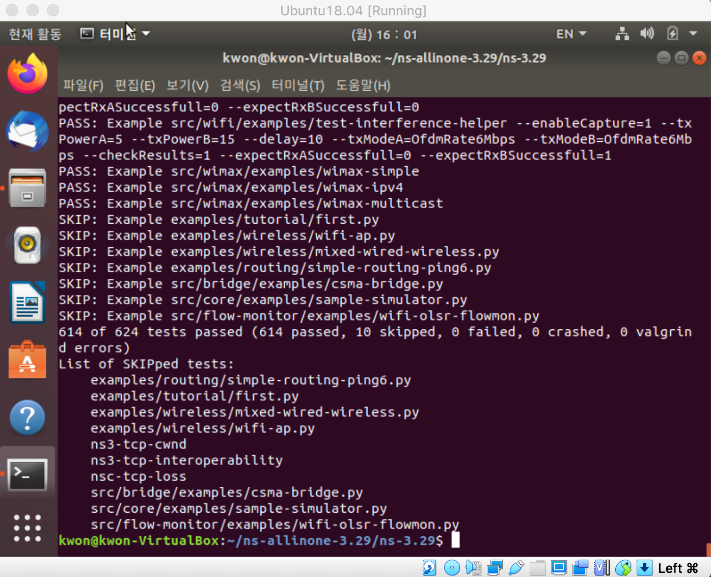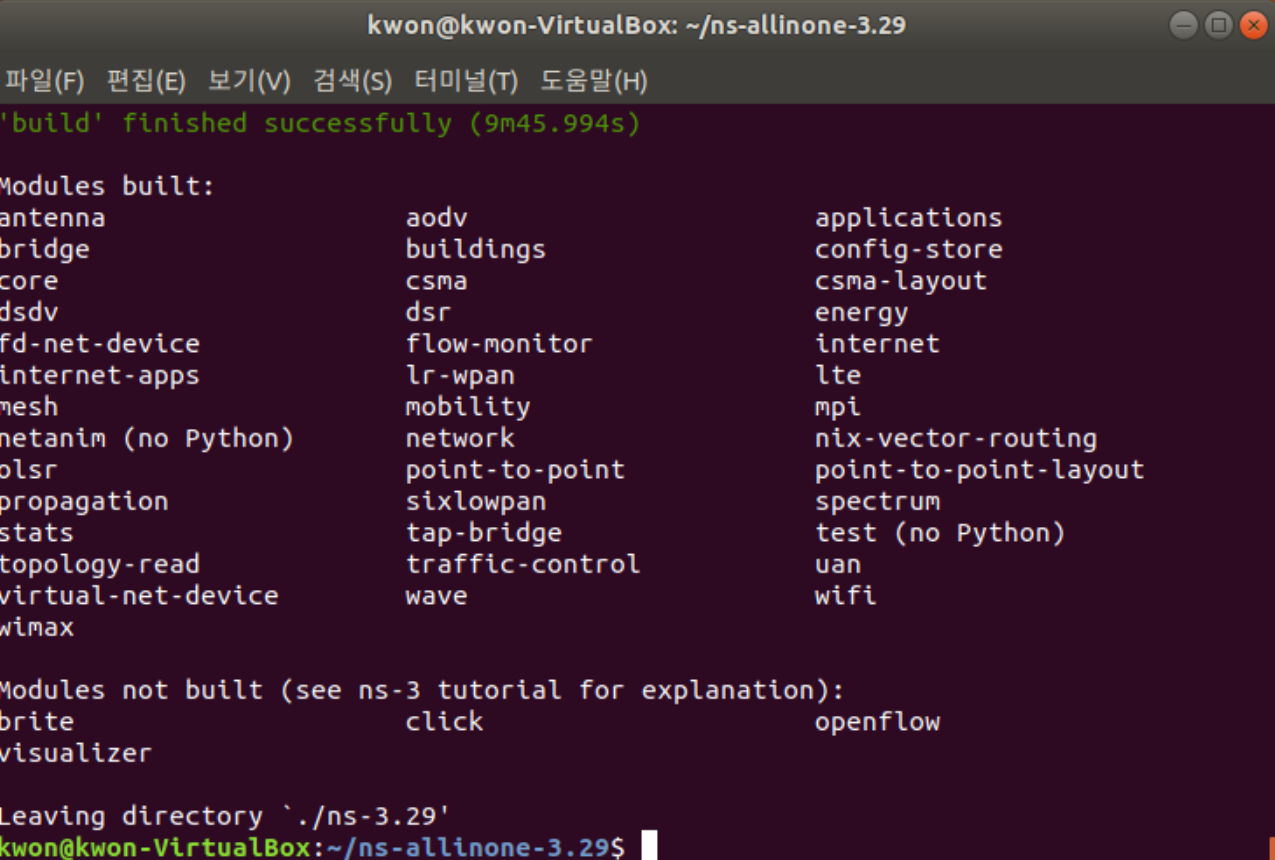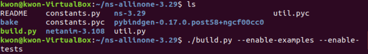 이제 터미널을 열고 다음 명령어를 통해 ns-3을 빌드합니다.