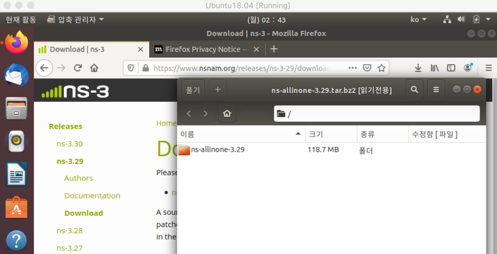 Ubuntu에서 다음 홈페이지에 들어가서 원하는 ns-3 버전을 다운로드합니다.